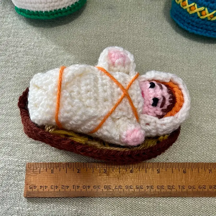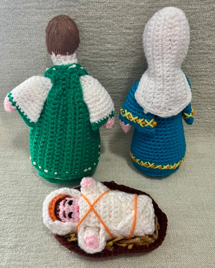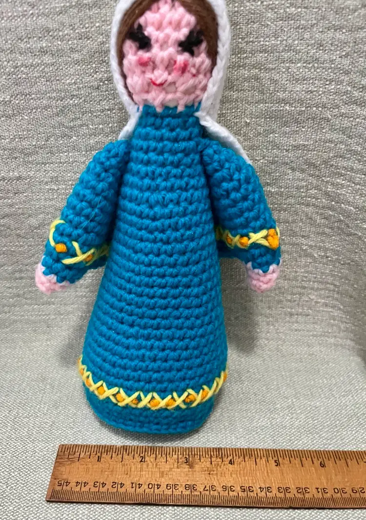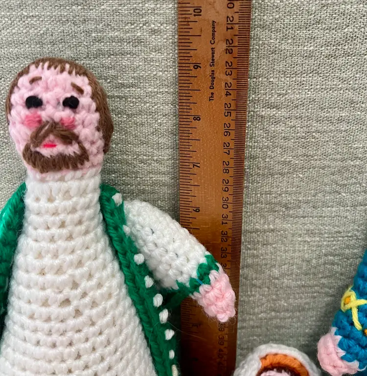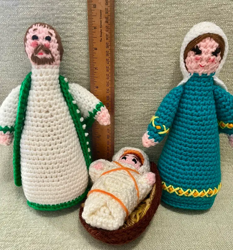 This hand-knitted or crochet Holy Family figurine set includes St. Joseph, the Virgin Mary, and Baby Jesus, perfect for celebrating Christmas. The figurine set is made of fabric and features a multicolor yarn use. Slightly weighted with stuffing. As these are fabric - a great addition to anyone wanting an stress-free, unbreakable display of the Holy Family. With St. Joseph approximately 9 inches and measurements provided on the individual pieces. The figurine set is free-standing and easy to care for, making it a great addition to any room in your home. Handmade in the United States, this unique homecrafted piece is a beautiful representation of the birth of Christ.