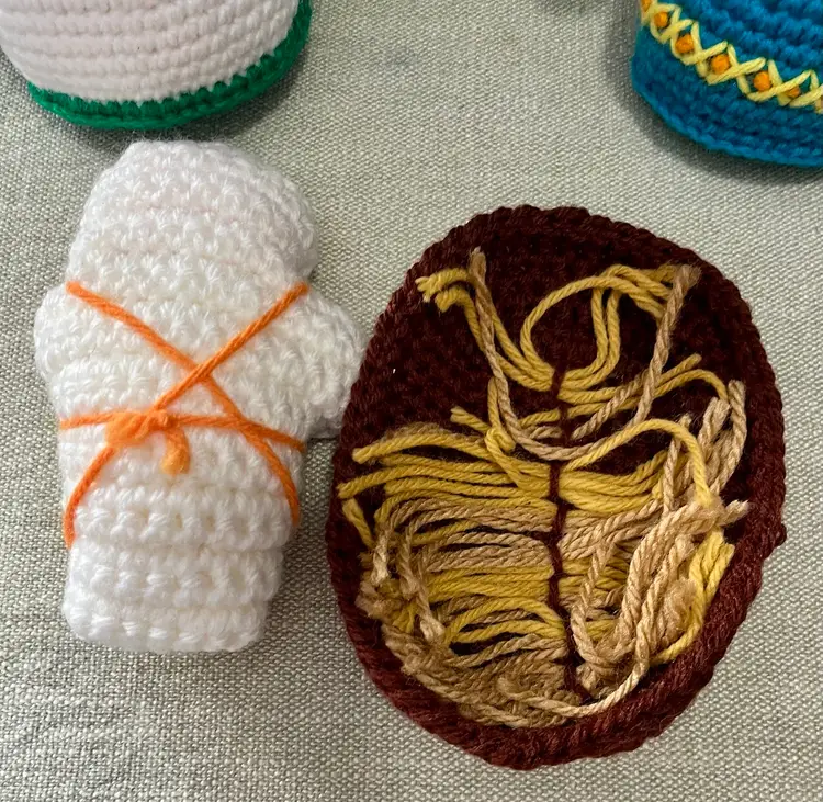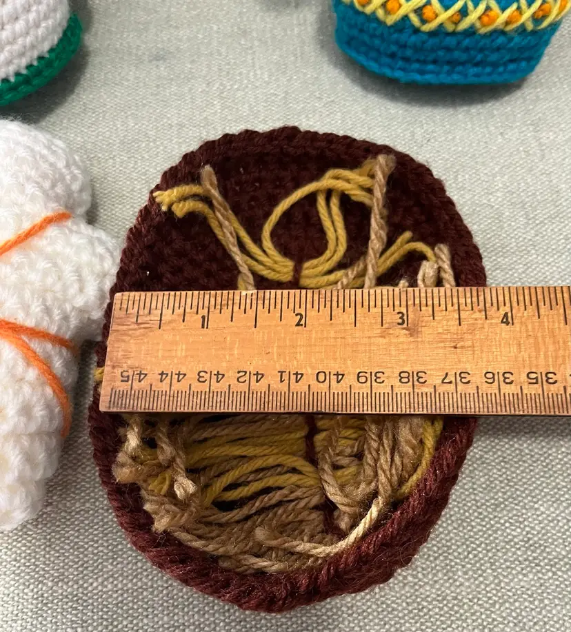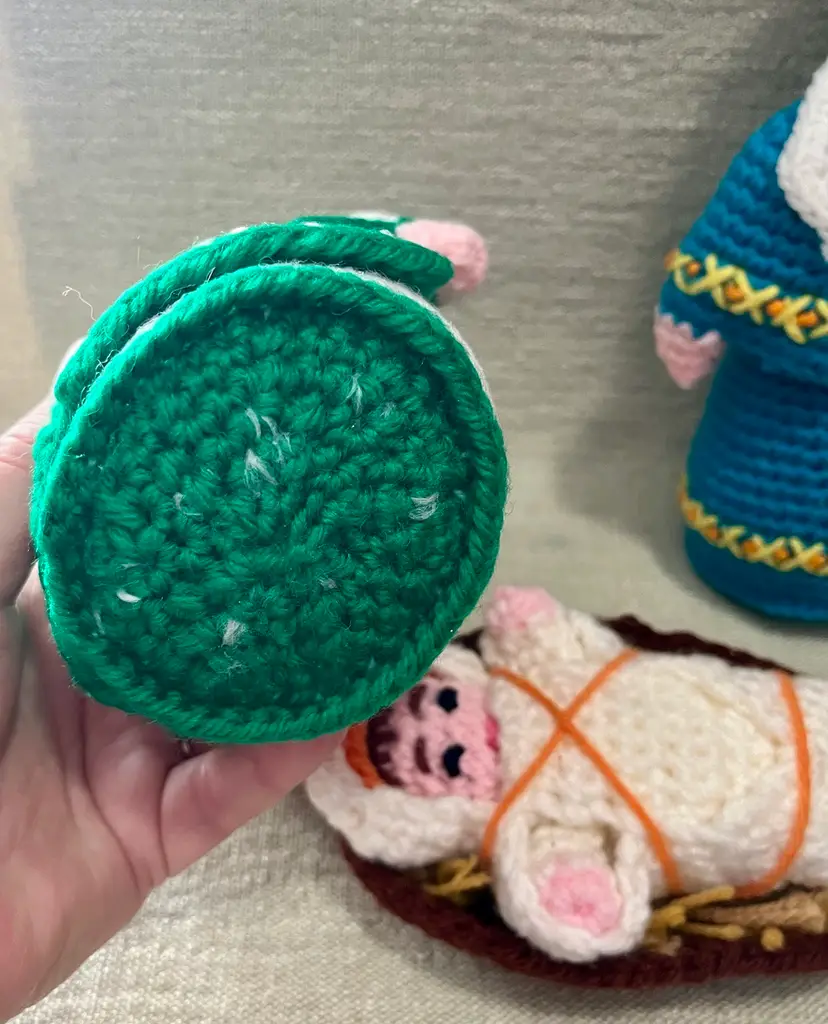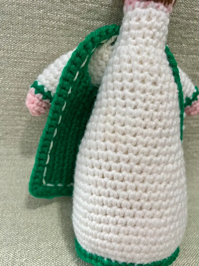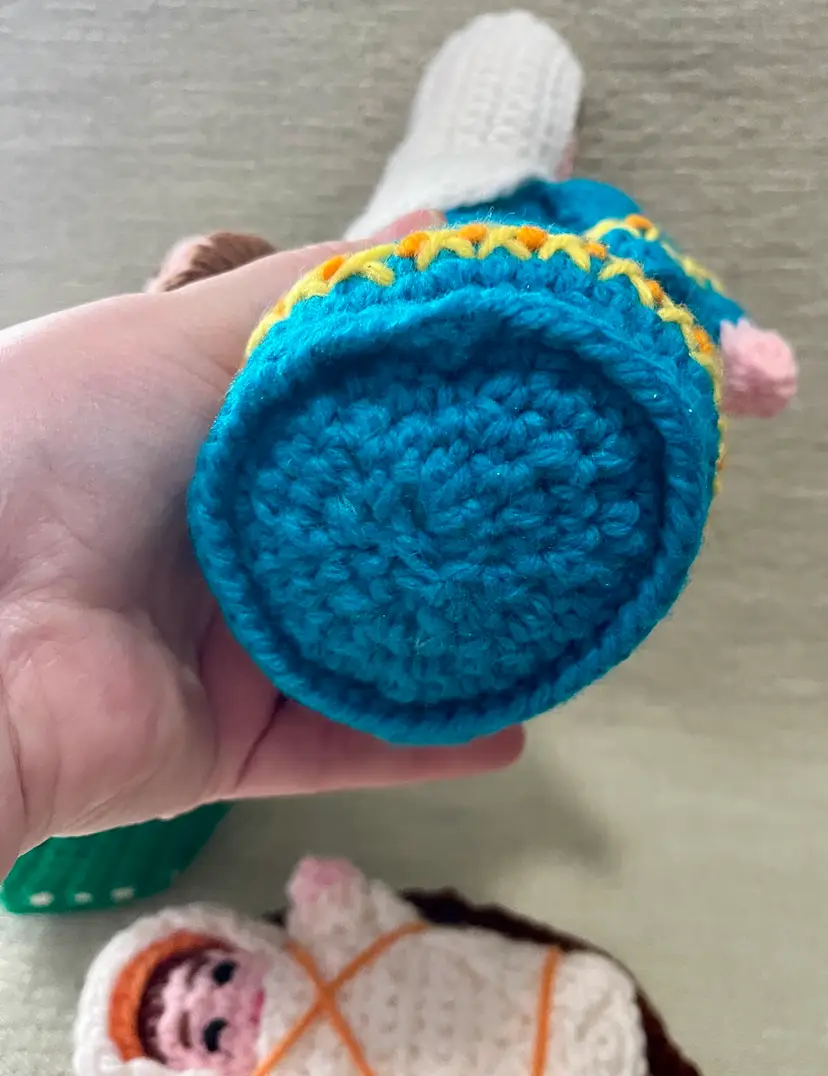 This hand-knitted or crochet Holy Family figurine set includes St. Joseph, the Virgin Mary, and Baby Jesus, perfect for celebrating Christmas. The figurine set is made of fabric and features a multicolor yarn use. Slightly weighted with stuffing. As these are fabric - a great addition to anyone wanting an stress-free, unbreakable display of the Holy Family. With St. Joseph approximately 9 inches and measurements provided on the individual pieces. The figurine set is free-standing and easy to care for, making it a great addition to any room in your home. Handmade in the United States, this unique homecrafted piece is a beautiful representation of the birth of Christ.