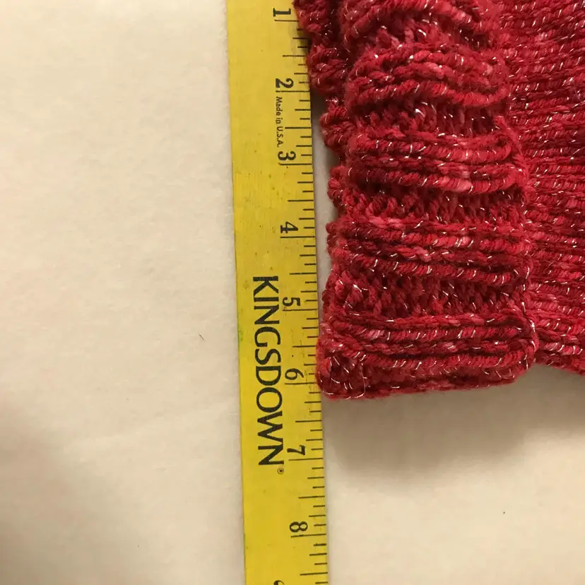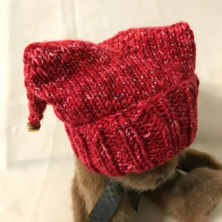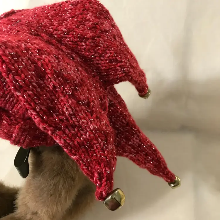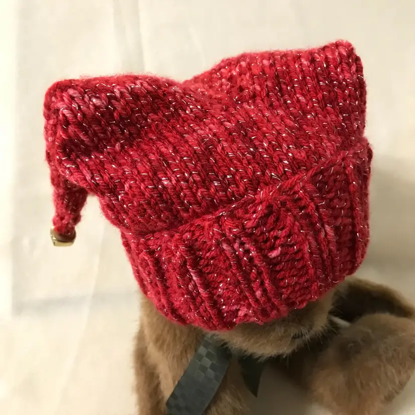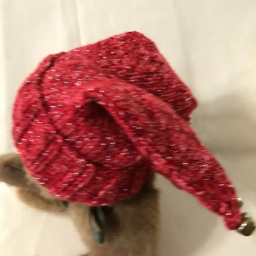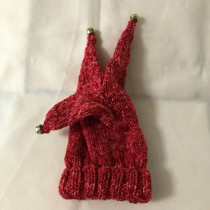 An adorable red sparkle jesters cap hand knit for baby. Made from 100% acrylic yarn, this cap is easy care- machine wash.