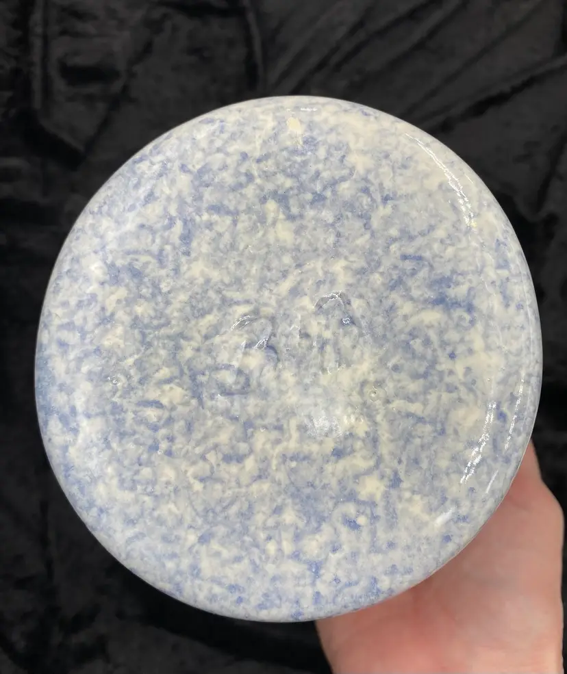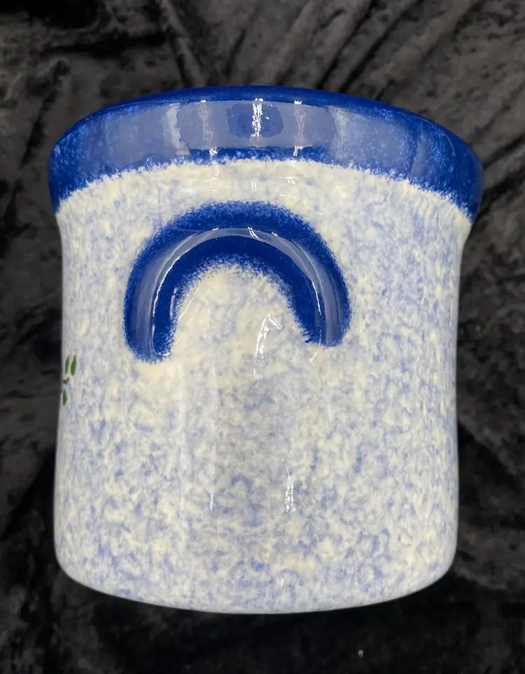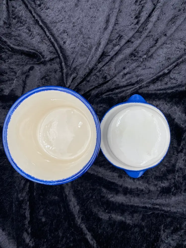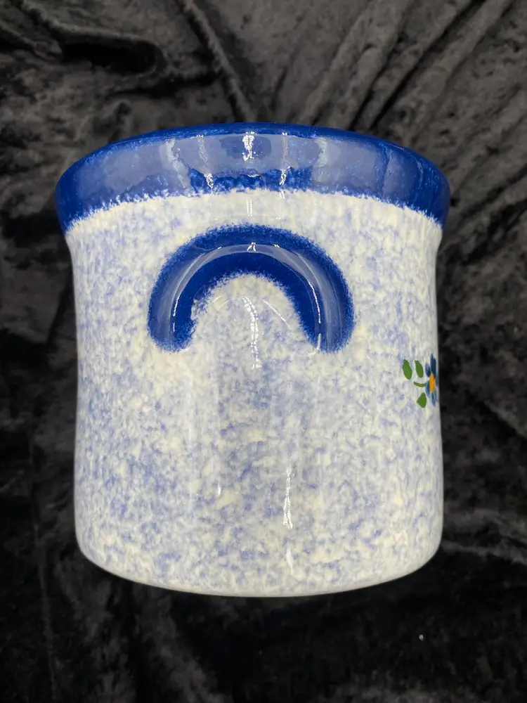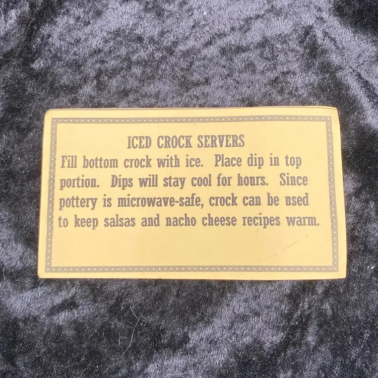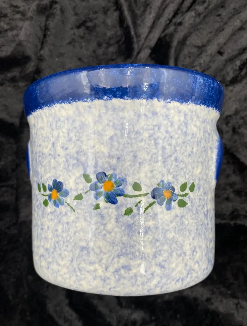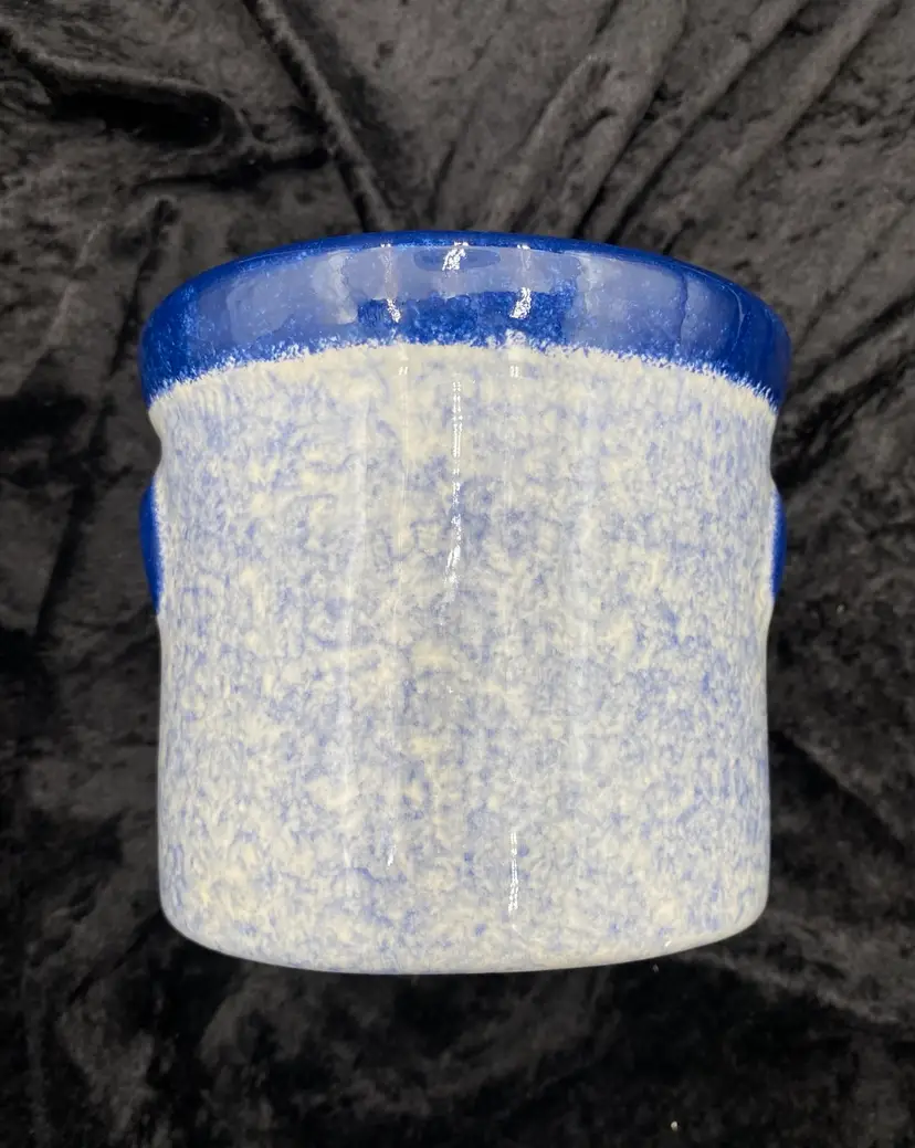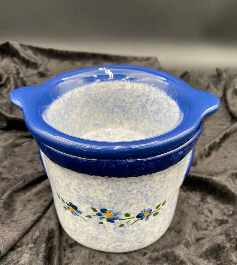 This beautiful two-piece hand-made "B+B" Ceramic Iced Crock Server is perfect for all occasions. The painted blue sponge design serves as the background for the cobalt rims and handles as well as the sweet violets on the front. The round shape of the crock and dip bowl makes it easy to serve and the glossy finish adds a touch of elegance to your table setting. The set comes with an instruction card, indicating that it can be used for chilling or for keeping cheese/dips warm from the microwave.