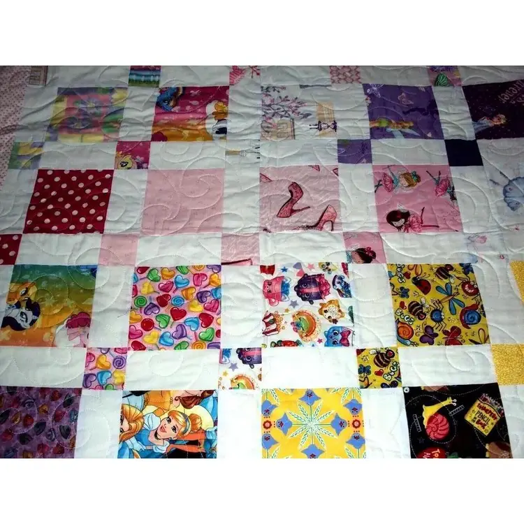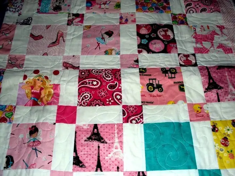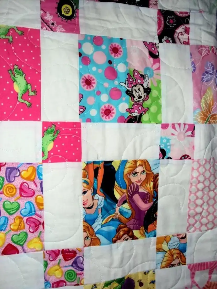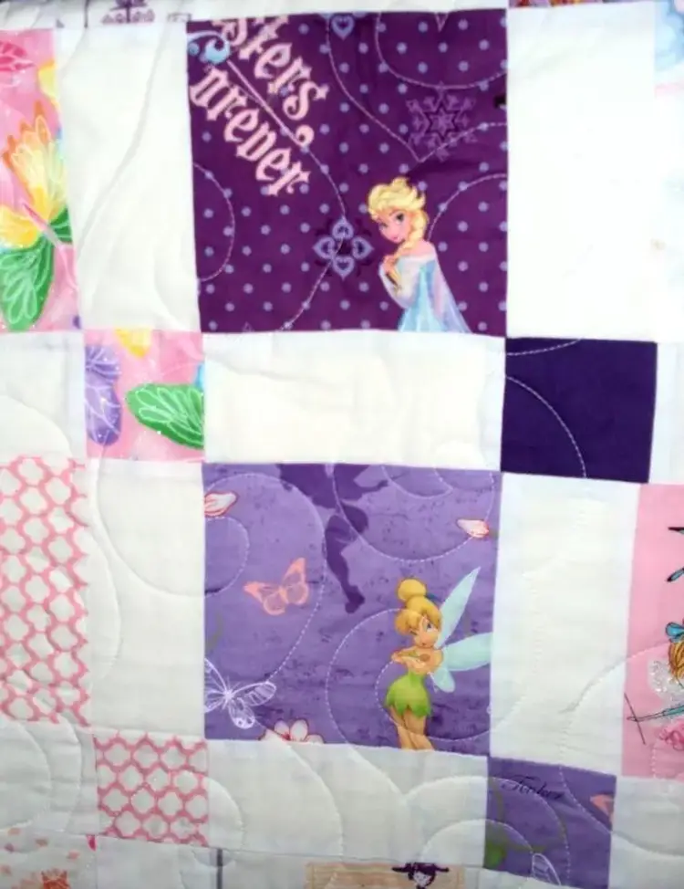 Very nice blanket. Has Tinkerbell, John Deere, Princess, & Frogs on it.