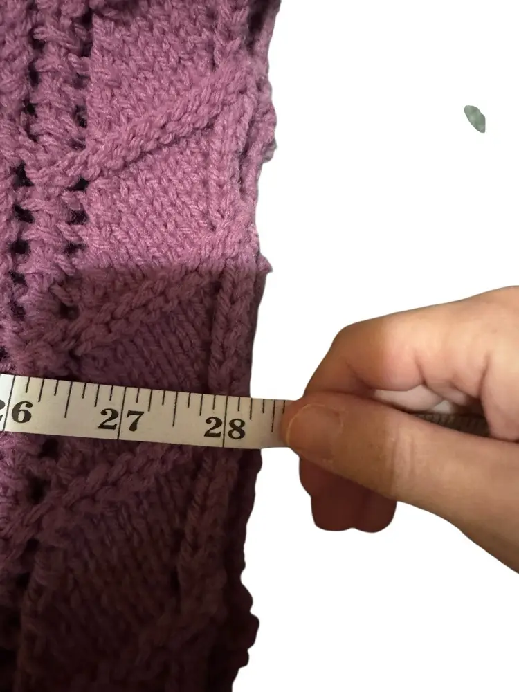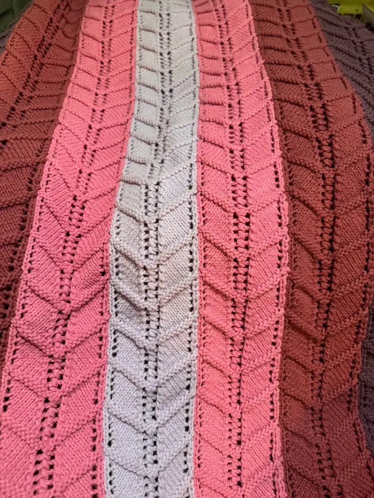 Hand made knitted chevron “V” knitted heavy blanket. This is a gorgeous afghan!! It’s warm and cozy and in excellent condition! This is made of worsted weight acrylic yarn. Beautiful pinks and purples. 56”x60”. No holes, no tears.