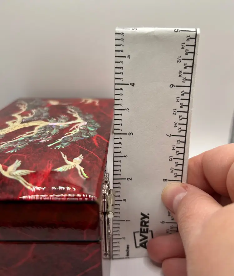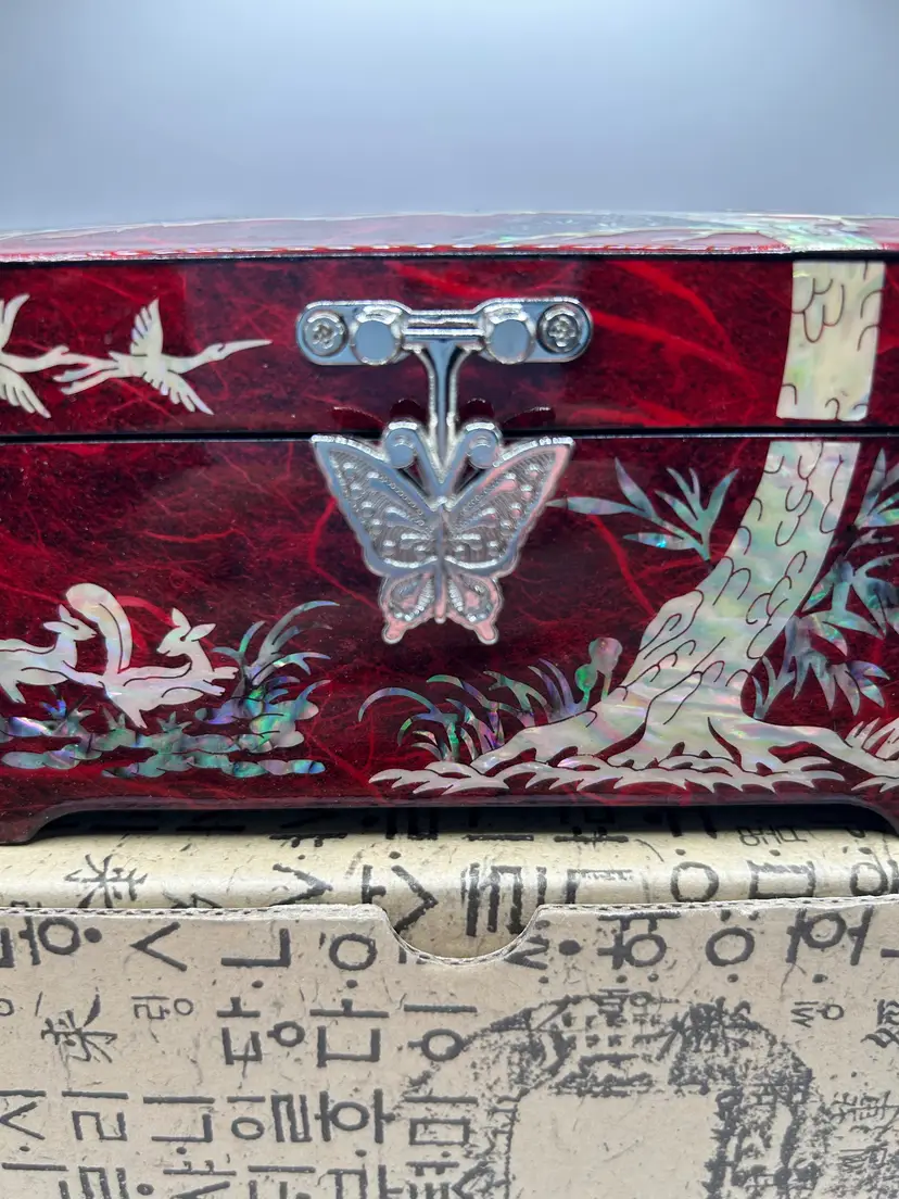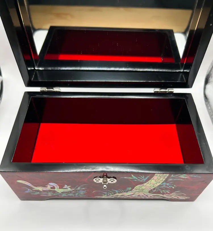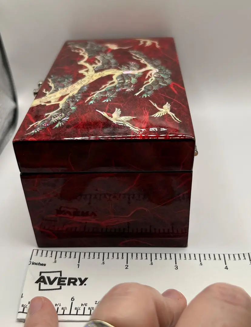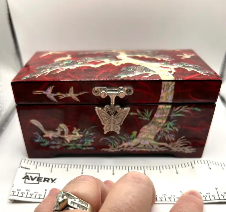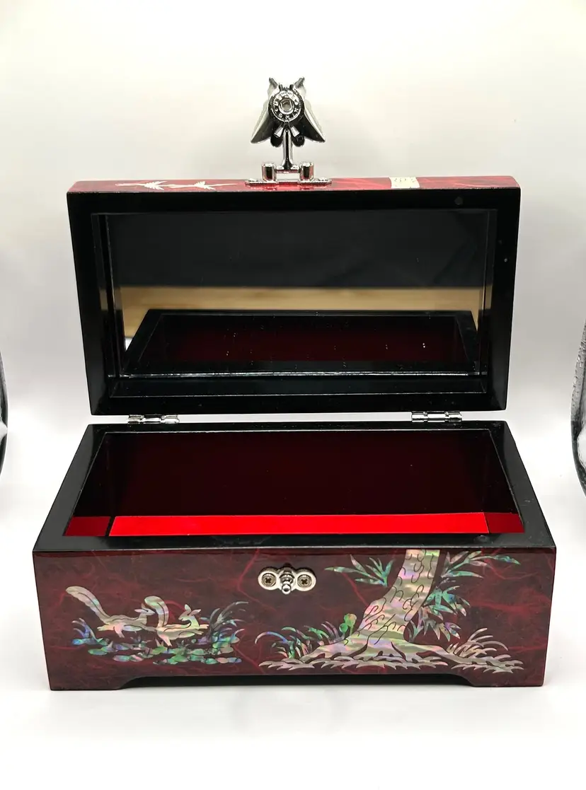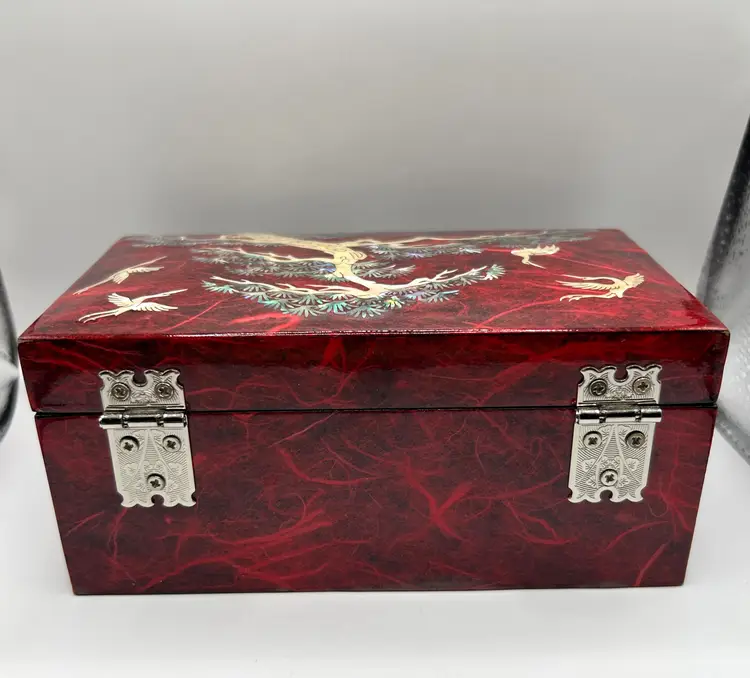 Beautiful red lacquered wood. Depicts a pine tree, cranes, and squirrels. Butterfly shaped silver tone metal clasp. Red velvet bottom and mirror inside.