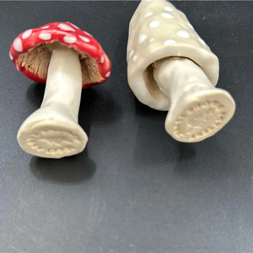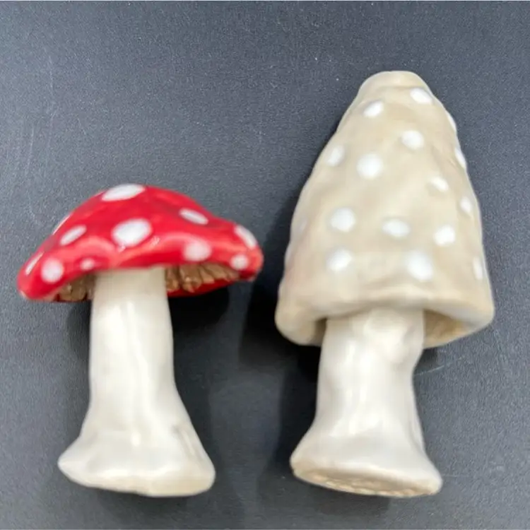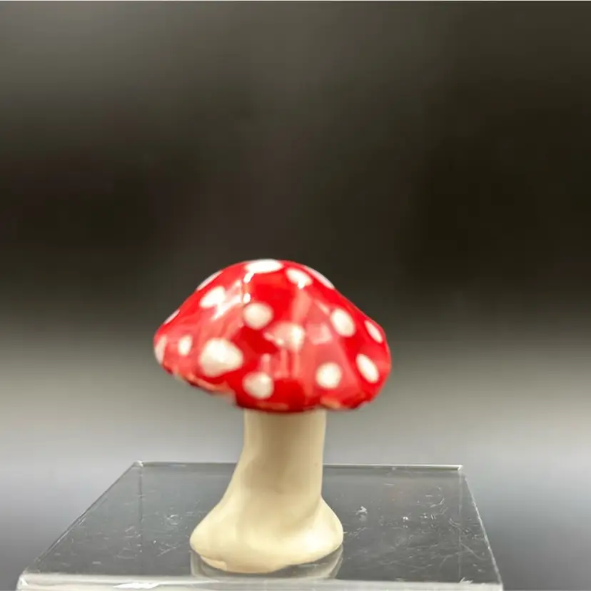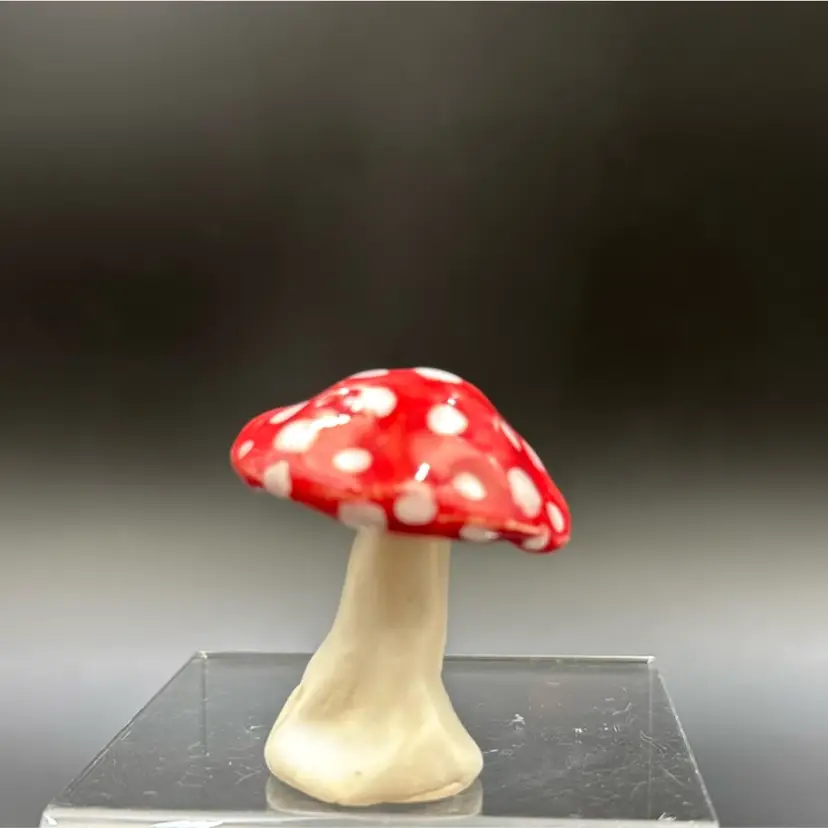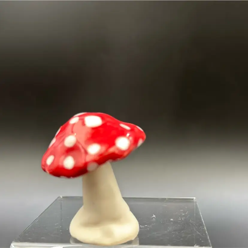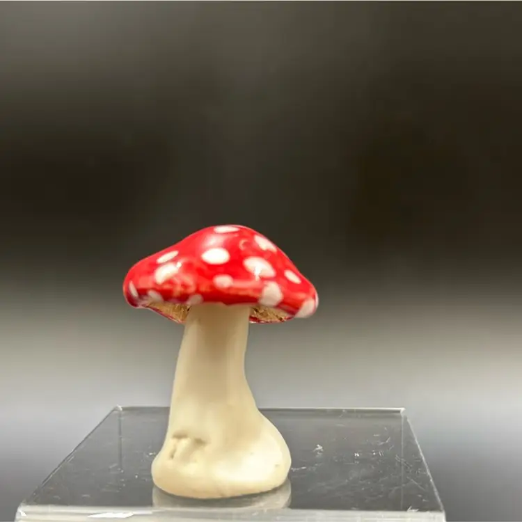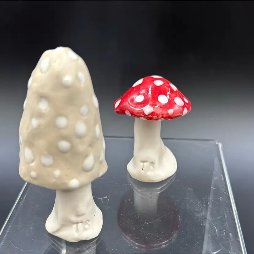 11/2”W light natural Cole with polka dot 3”T red polka dot the red mushroom has a fine hairline fracture. It’s solid, but it just didn’t take it one spot. I reinforced it with some superglue.