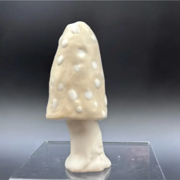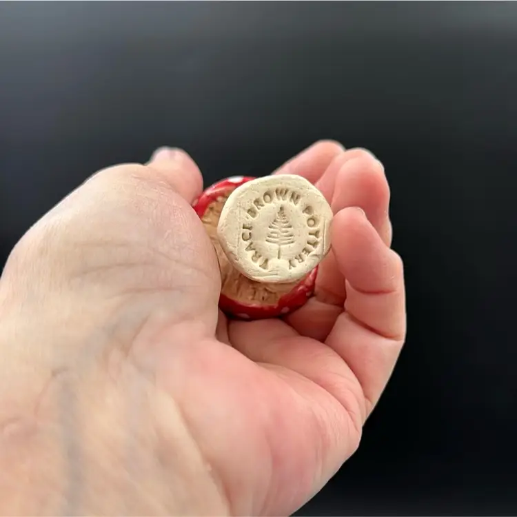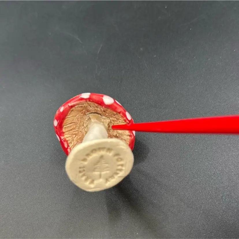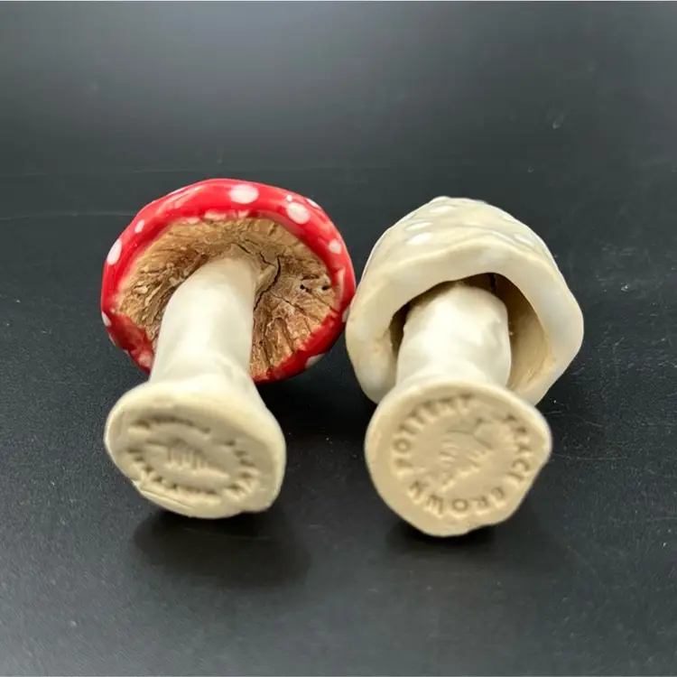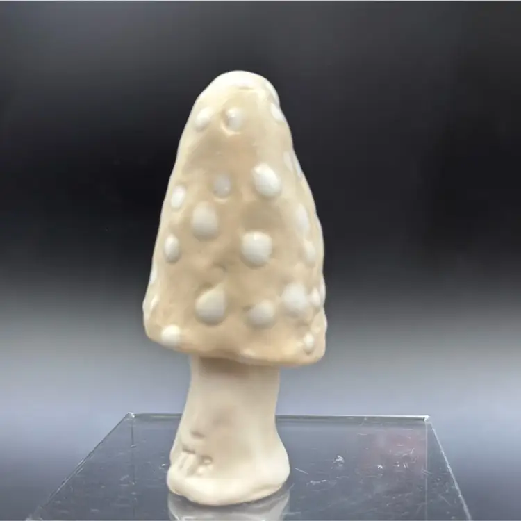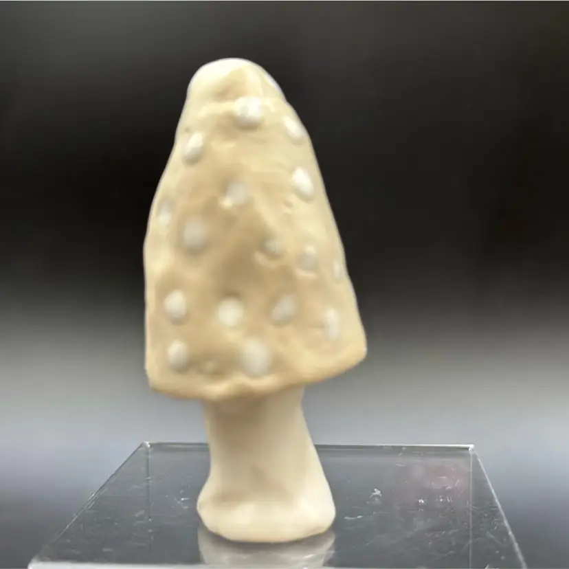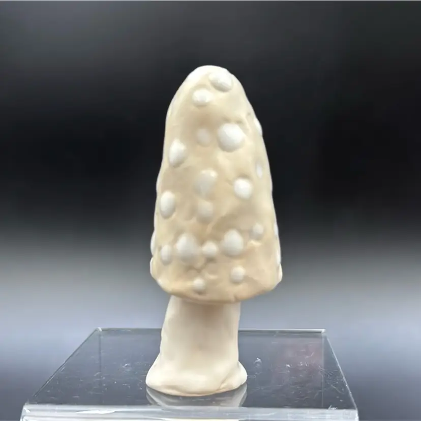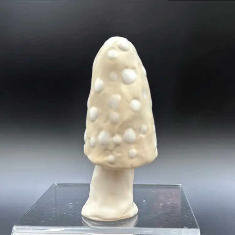 11/2”W light natural Cole with polka dot 3”T red polka dot the red mushroom has a fine hairline fracture. It’s solid, but it just didn’t take it one spot. I reinforced it with some superglue.