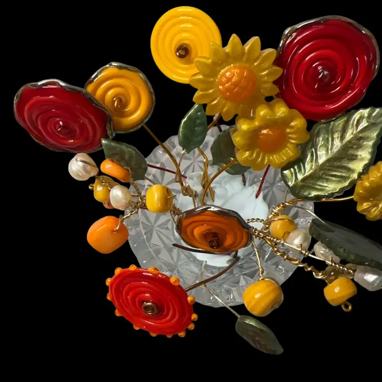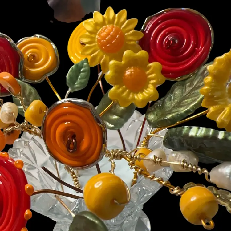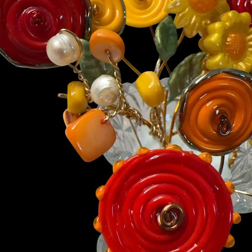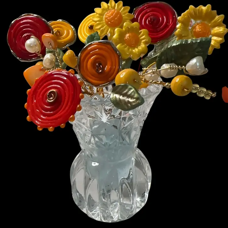 This is hand made by me. It measures 4 inches high. The vase is lead crystal tooth pick holder. Some of the flowers are lampwork beads. The others are resin that I made.