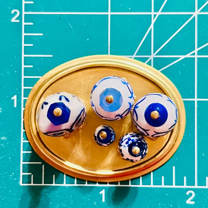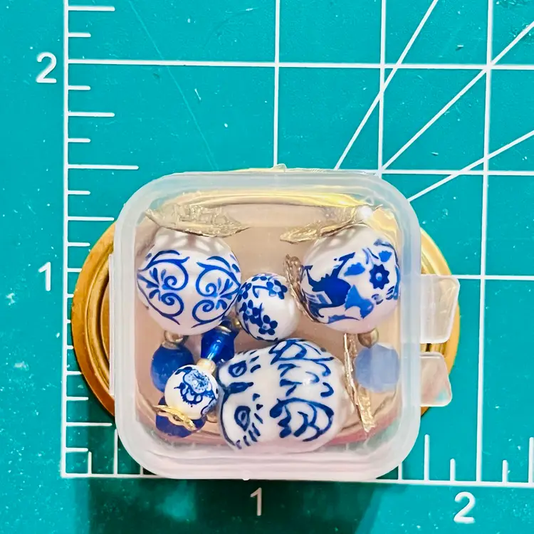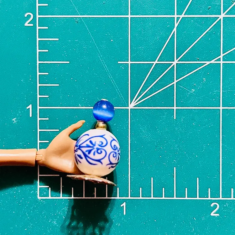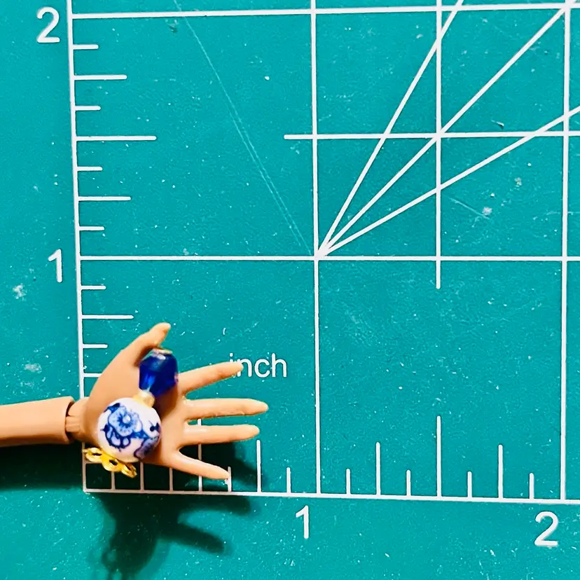 There are FIVE (5) bottles and one BRASS tray. These are 1:6 or Barbie doll sized scale. The doll hand in the photos is a Monster High doll for reference. Sizes range from .5” H to 1” H. brass tray: 1 7/8” x 1.5” Bottles DO NOT open. These are FRAGILE, COLLECTIBLE pieces and NOT for young children. They are made of ceramic with glass beads NO DOLL INCLUDED they will come in the storage case as shown in the photos. My items are shipped from a smoke free, cat friendly home.