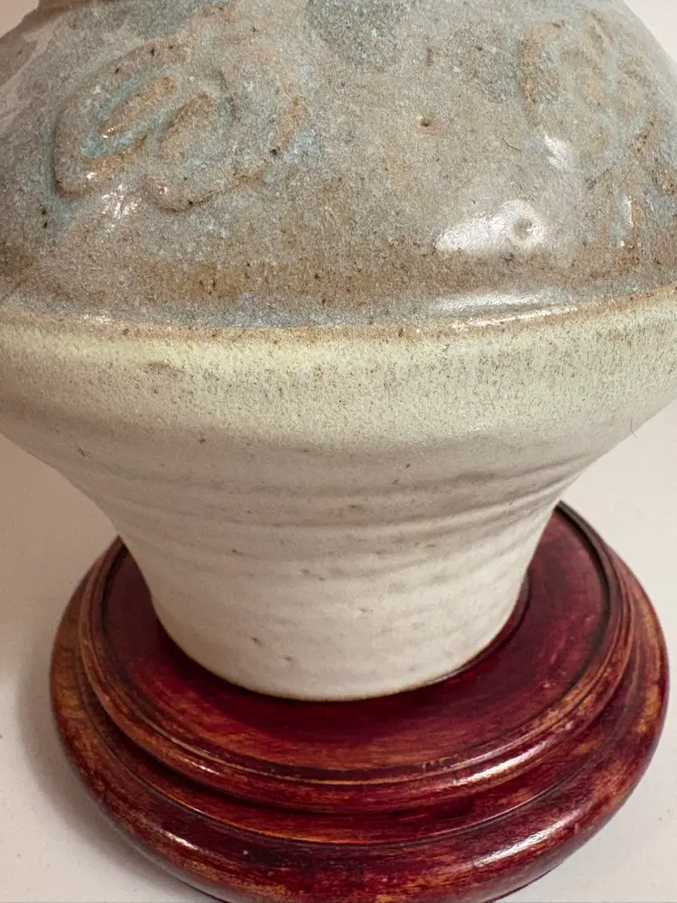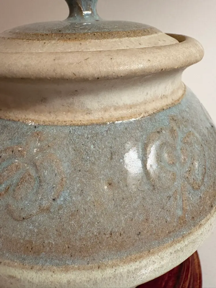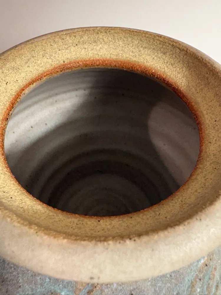This Hand Made Studio Pottery Pot with shell shaped Lid is a unique and beautifully crafted piece that is signed by the artist. The pot features a biege and gray color palette, standing at 9 inches in height, and has a matte finish. With its studio production technique and handmade quality, this decorative pottery item adds a touch of artisanal charm to any space.
