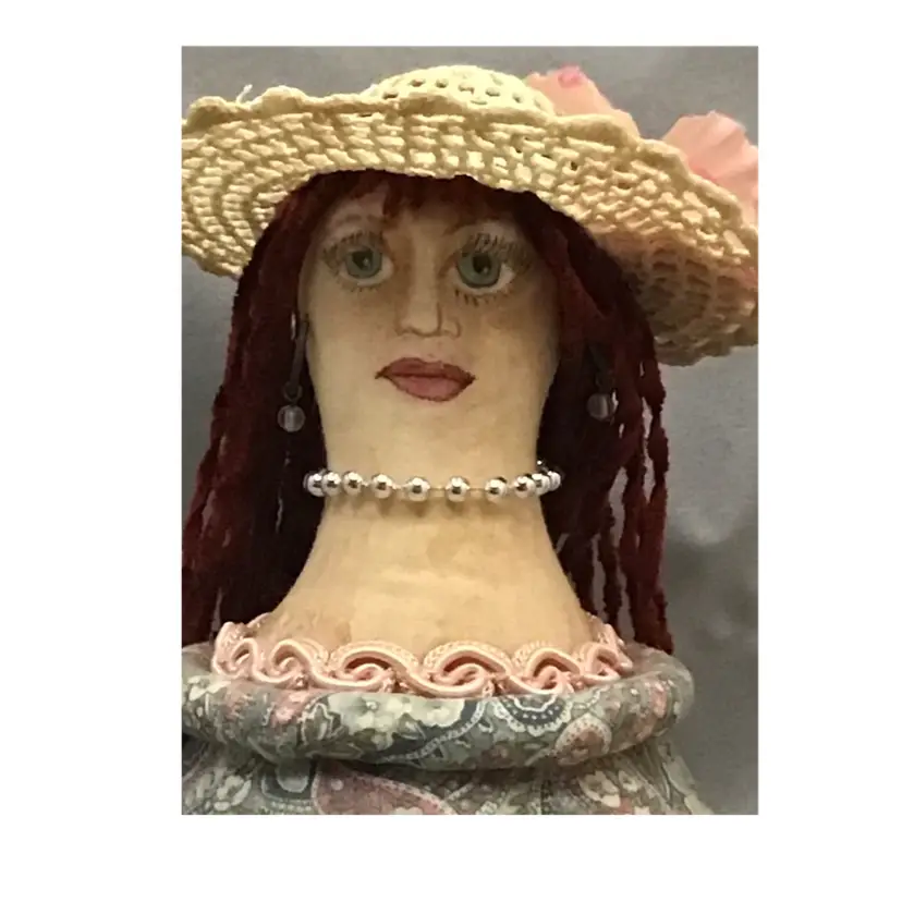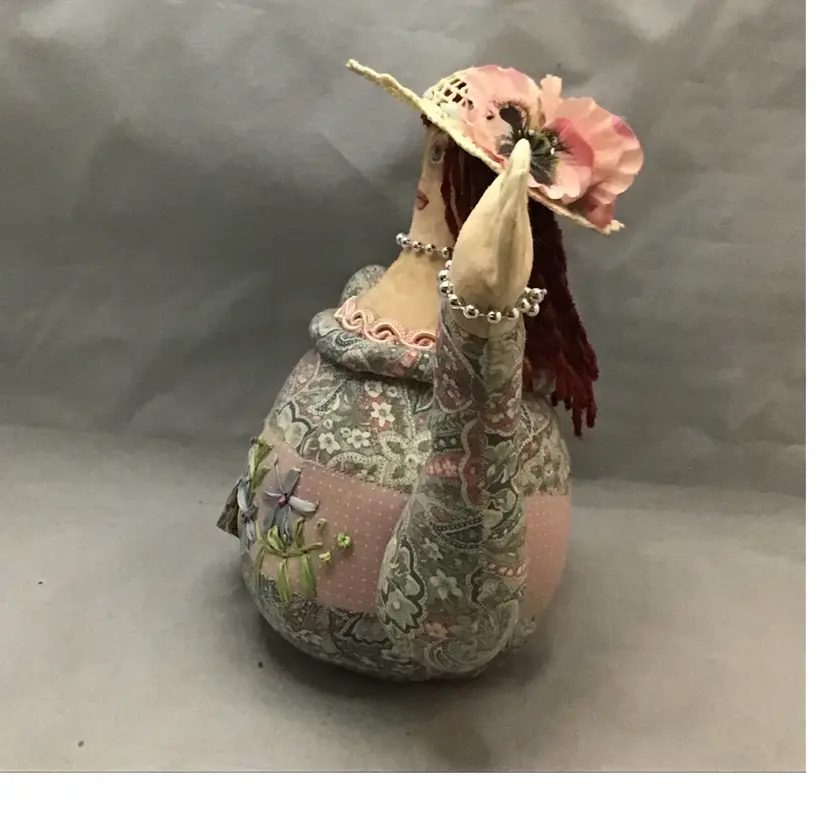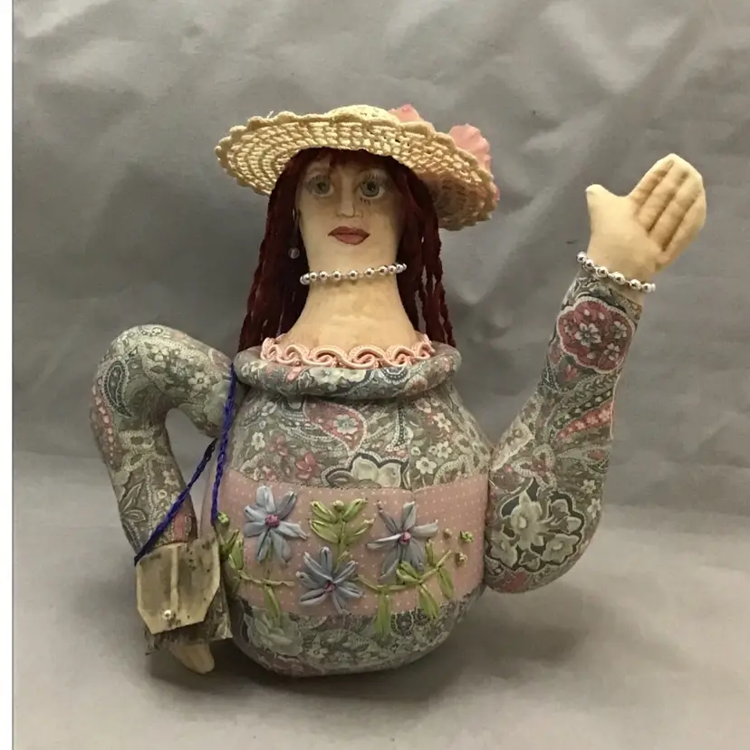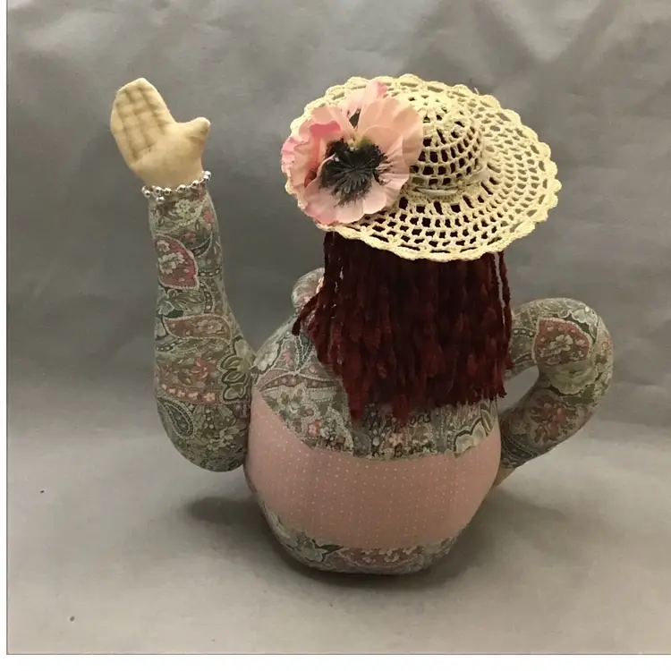 This is my teapot doll. I used to have a business called Robin's Nest Creations. I made this doll more than 25 years ago. She is made from cotton fabric, hand silk embroidered, and hand sewn together after machine seaming. Her hair is made from velvet chenille yarn and her face is hand drawn and colored with soft colored pencils and sprayed with a fixative. She has a crochet doily hat with applied silk flowers. She used to have Feathers in the hat as well, but they disintegrated over time and will need to be replaced. She has a hand made shoulder bag made from a real Lipton Teabag, and has Modge Podge used to seal it . Her earings have lost their shine but she does still have some hoops with crystal dangle drops on them. (need replacing also) She also used to have a silverplated necklace and bracelet but I swapped them out to plastic chrome beads becuause I was not able to polish the silver which had tarnished. She is about the size of a 2 cup teapot. Her head does not come off. She is stuffed with polyfill and weighted with Copper BB's She will be for sale. She is a one of a kind, as I adapted a pattern I had and changed it up completely by making her pot round instead of flat sided, and by adding a rim and collar and my own expressions on her face.