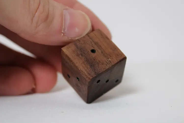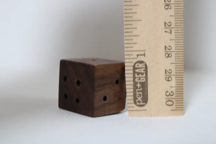 Dice are just under 1 inch by 1 inch, sanded, finished with a coat of Tung oil to bring out the wood grain, and then with a coat of polyurethane to bump up the dices durability