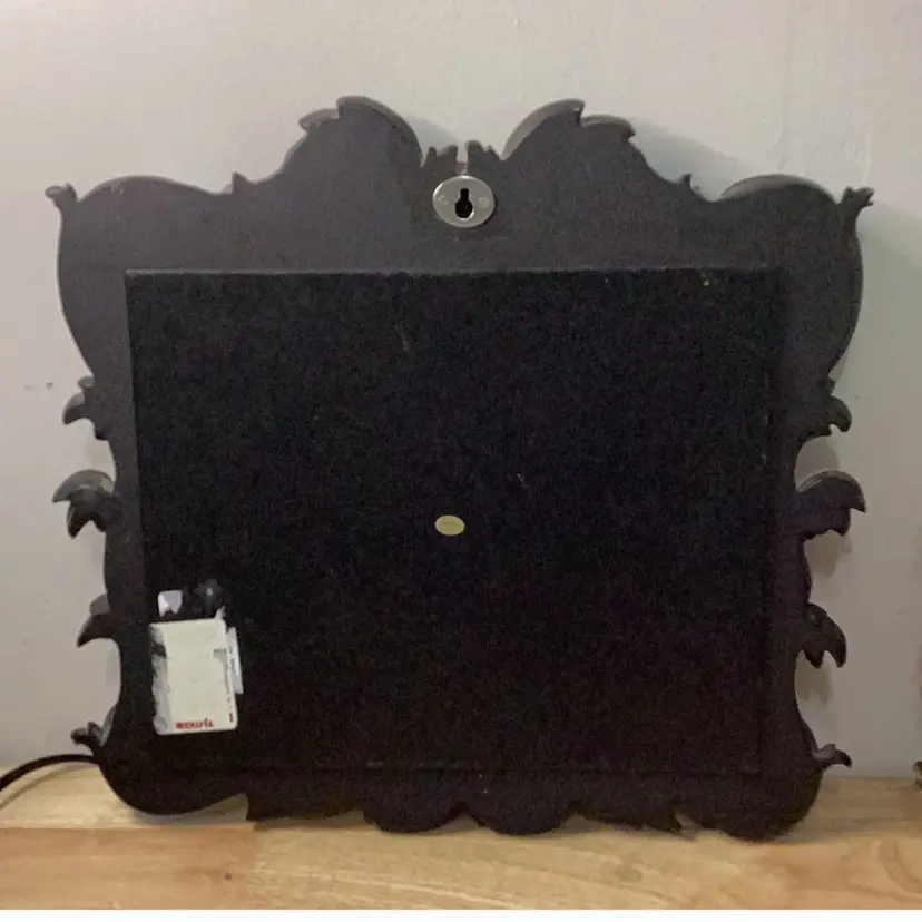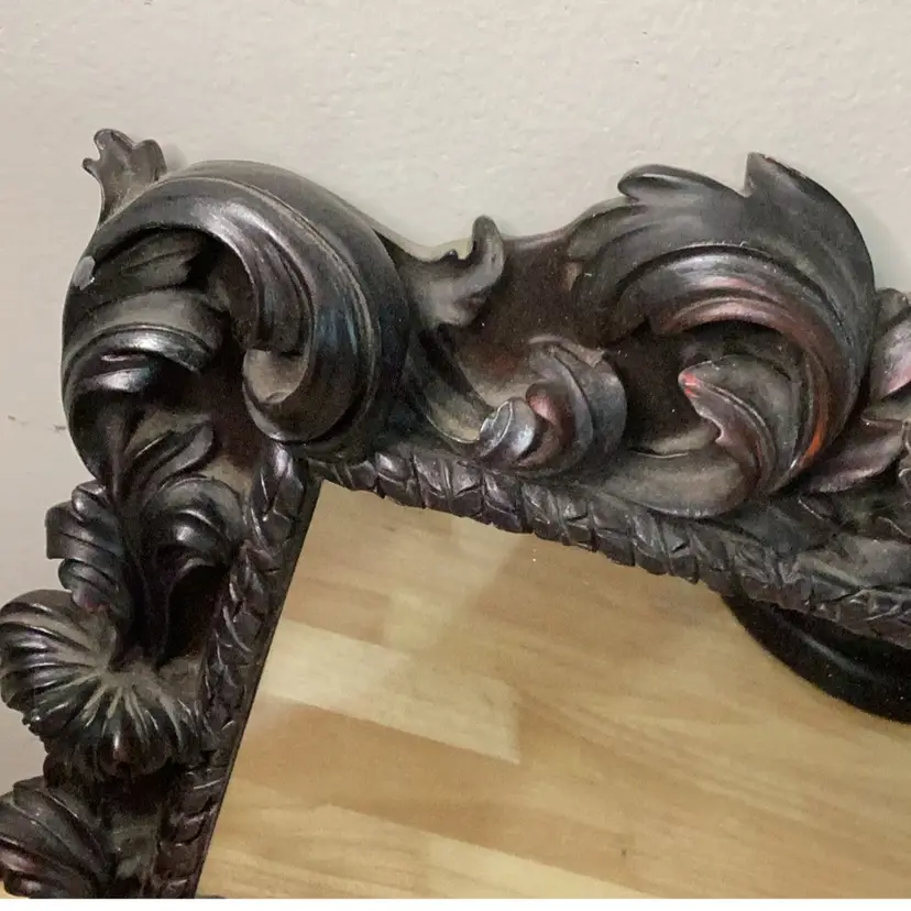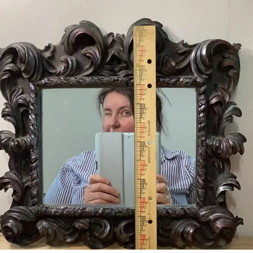Over 12” tall with flourishes, 13” wide. Quite heavy- frame is resin but mirror is thick glass. Thrifted mirror was repainted with a spooky/Halloween color scheme, perfect for gothic or macabre decor.