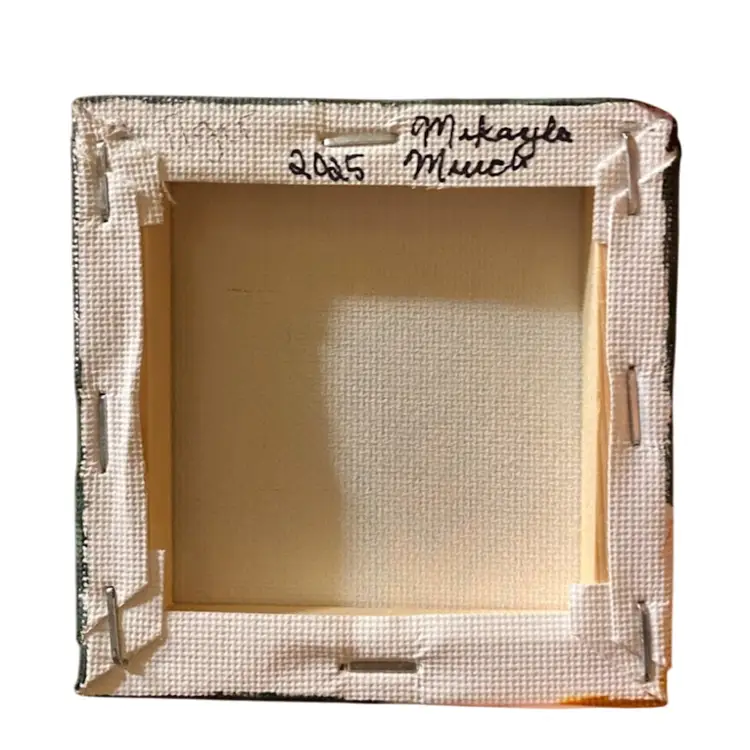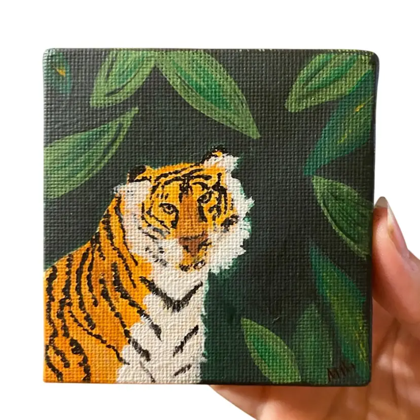 Hand painted Acrylic Canvas- Signed MM on front and Mikayla Mirich 2025 on back - Approximately 3 X 3 This is a hand painted canvas that is of a tiger in a jungle.
