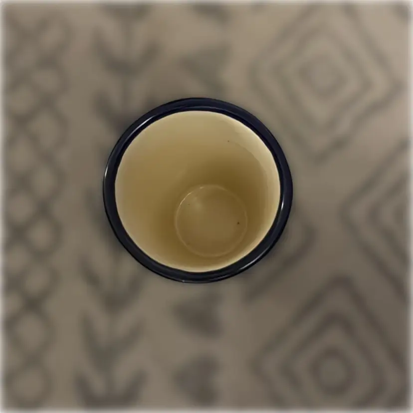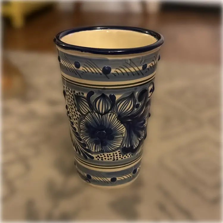 Hand-Painted & Hand-Signed Talavera Mexican Blue & White Pottery Cup / Vase. 5.5” tall, 2.5” in diameter at the bottom, and 3.5” in diameter at the top.