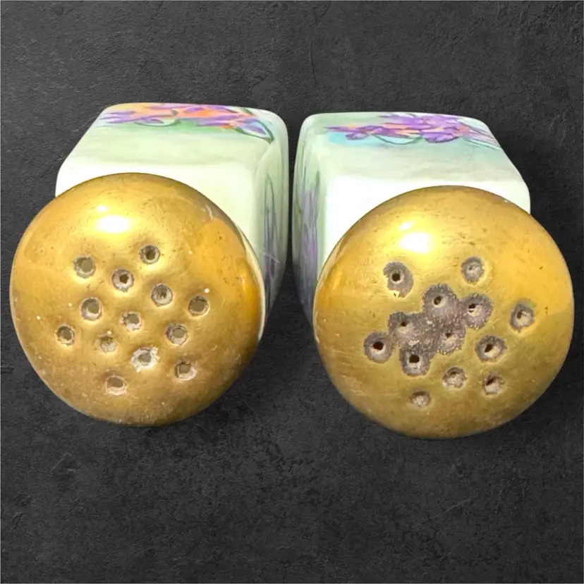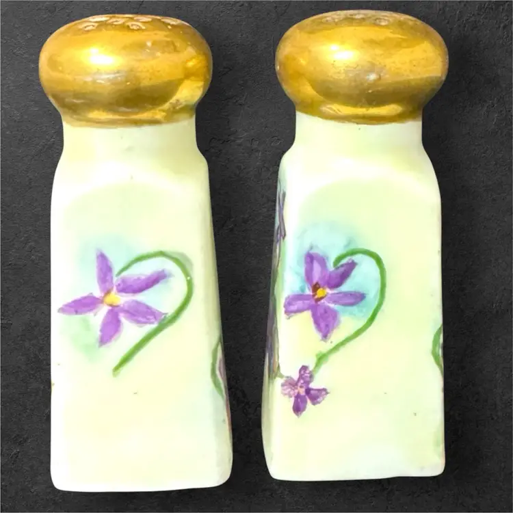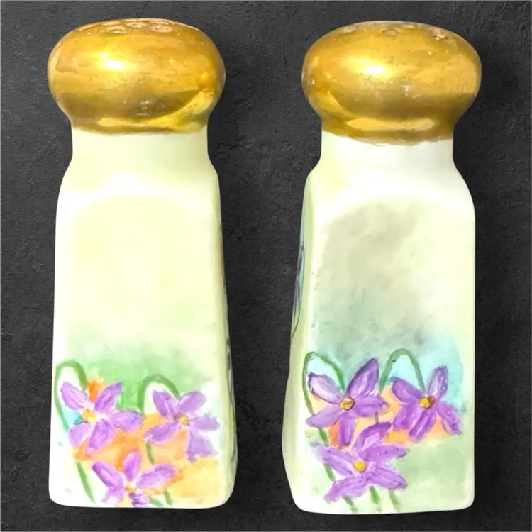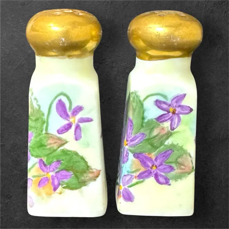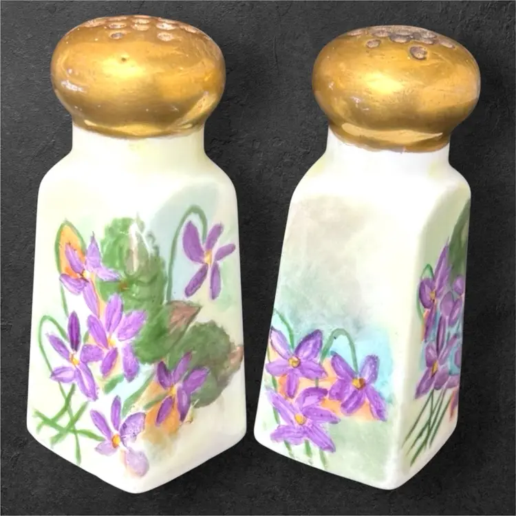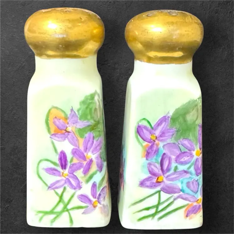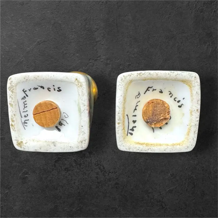 Stunning hand-painted ceramic salt and pepper shakers, signed by artist Thelma Francis and dated 1910. Amazing to hold these shakers in your hand and realize they are over a century old! Shakers are 3.5” tall and 1.5” wide at the base. Original cork stoppers are intact.