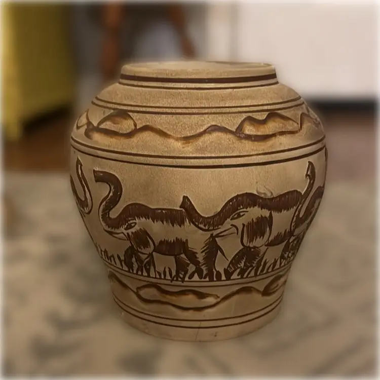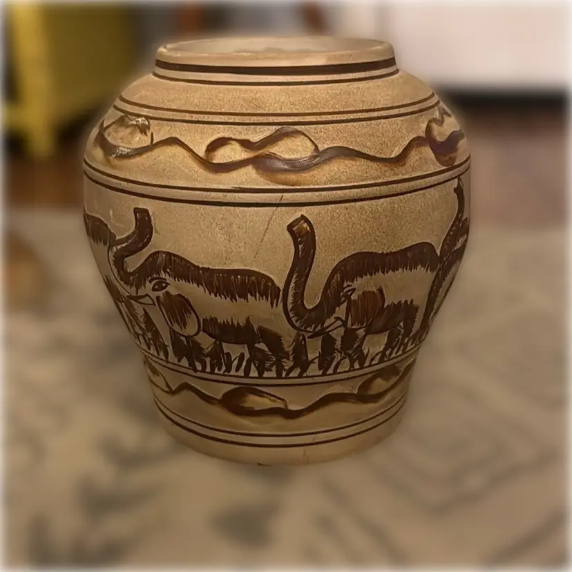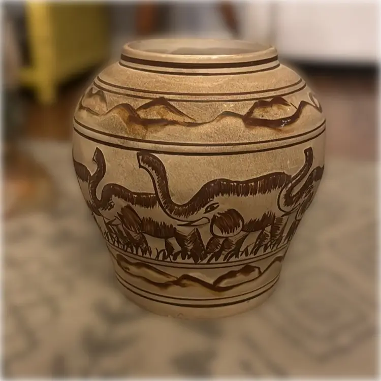 Hand-Painted Art Deco Vase with Elephant Herd. 7” tall, 5” in diameter at the bottom, and 4” in diameter at the top.