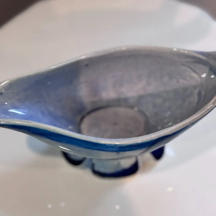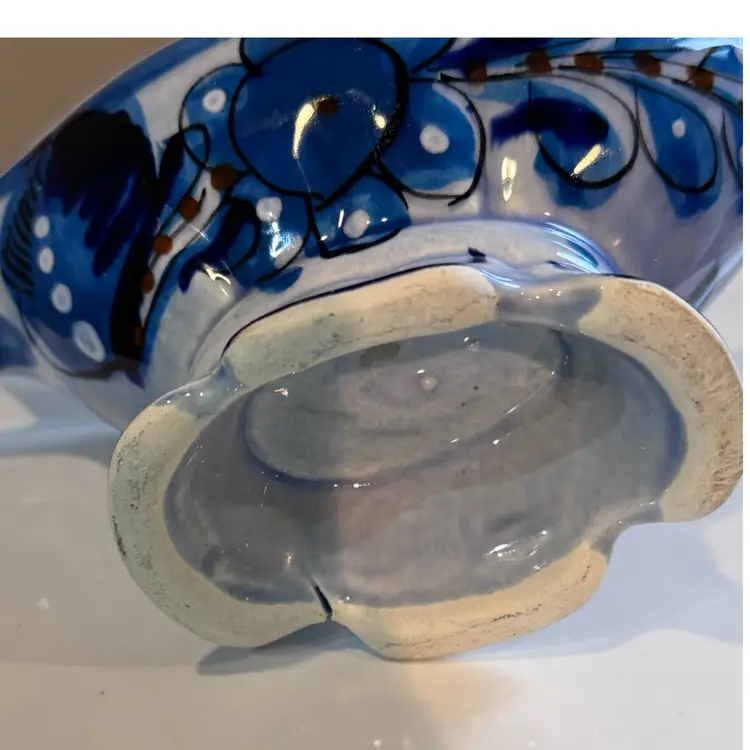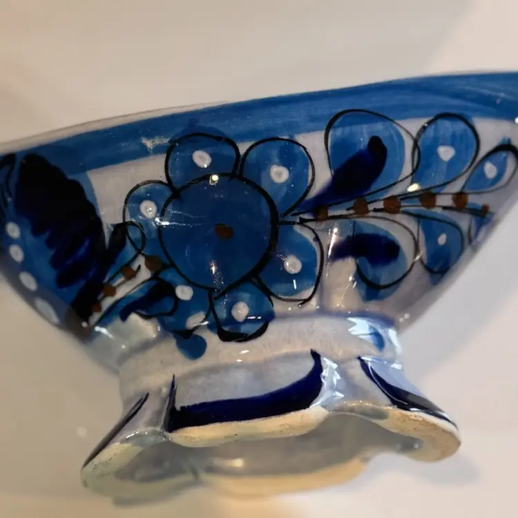 Beautiful shades of blue hand-painted gravy boat. Measures 4 1/2 inches tall at handle and 8 inches long. No chips or cracks. When researched I cannot tell if this is Mexican or Italian pottery, but an awesome piece for display.