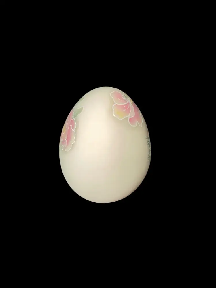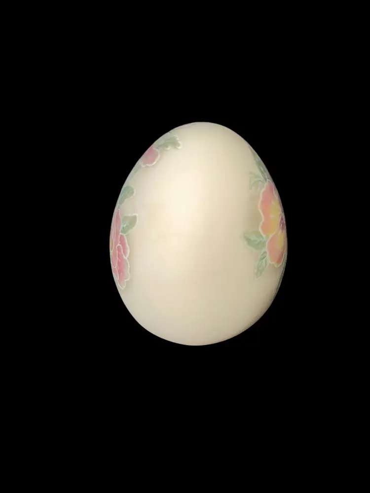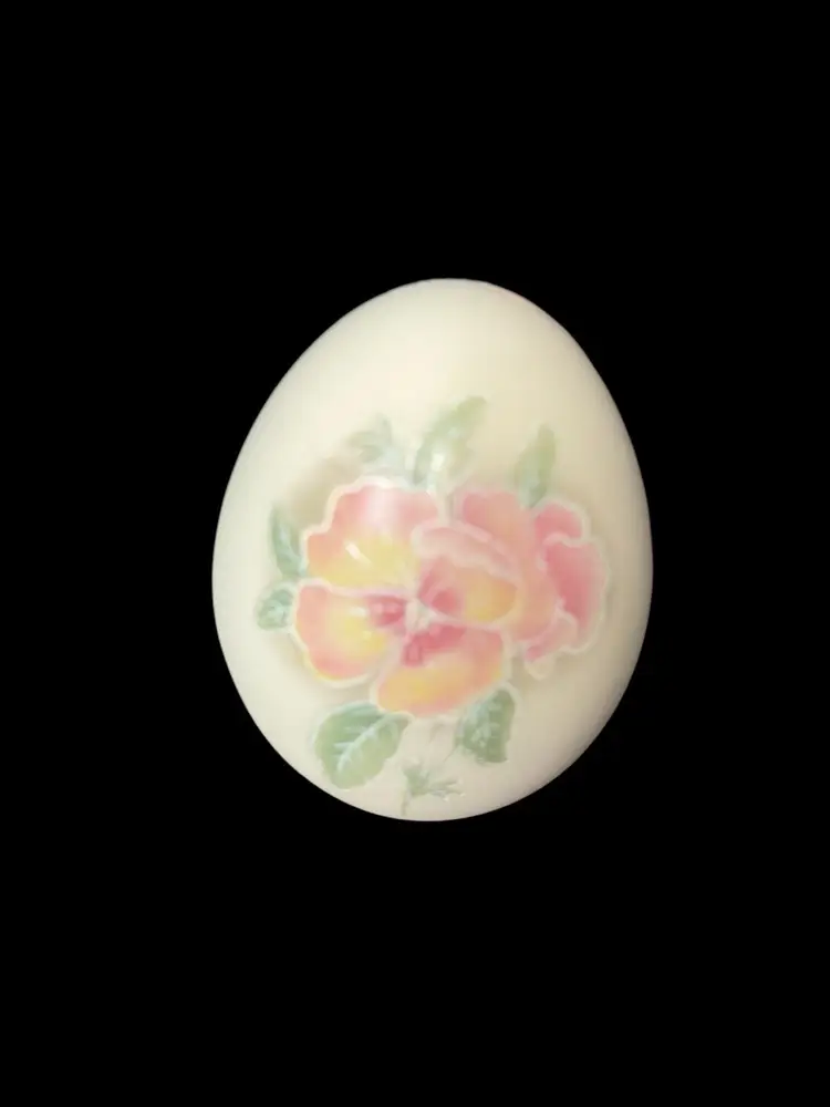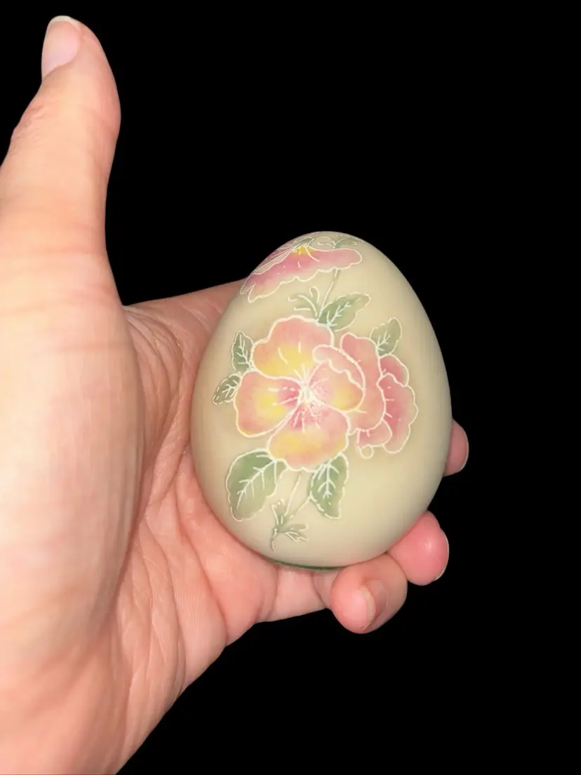 Very pretty may be a Womacks collectible, although it is not signed This vintage collectible egg is a unique addition to any collection. The hand-painted bisque egg features a beautiful pink flower pattern on a beige background. Measuring approx. 2 3/4 inches high it is an eye-catching piece.