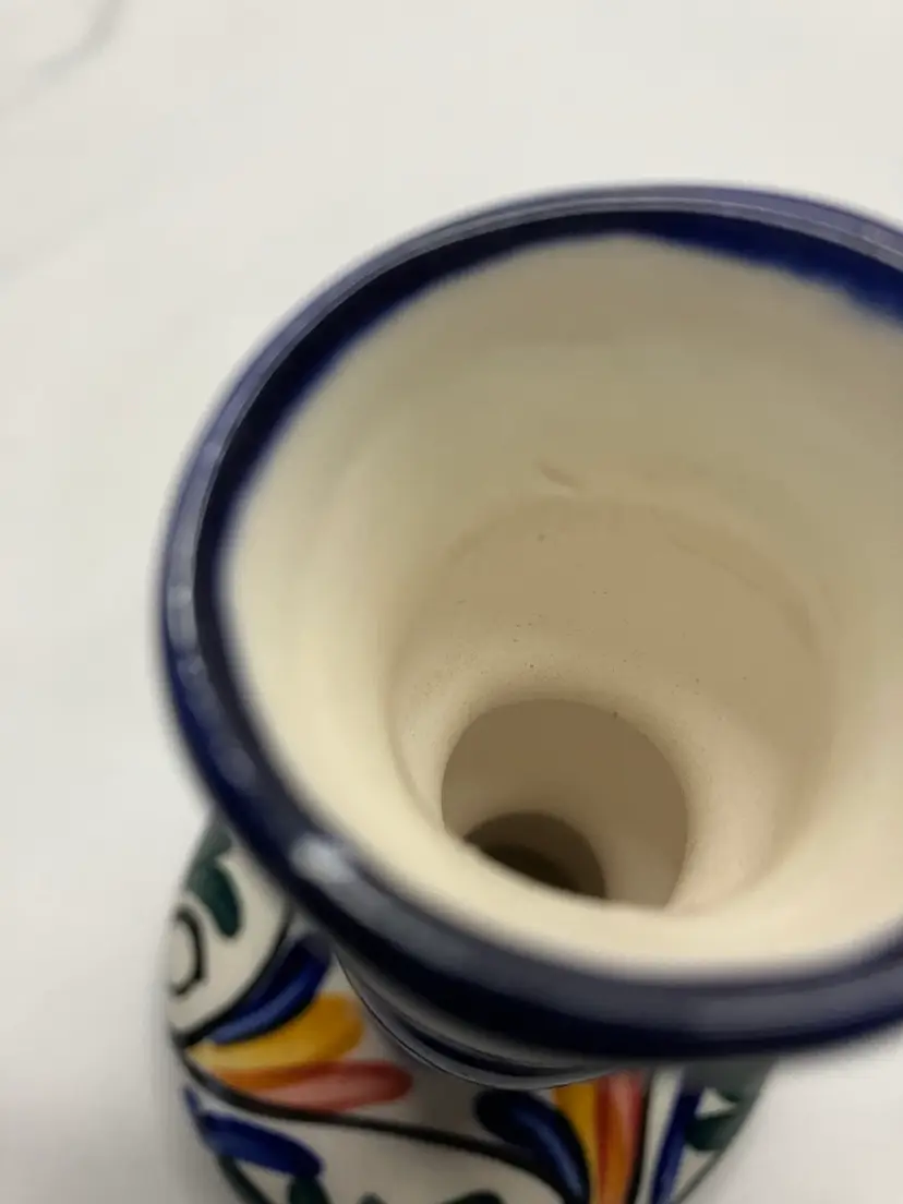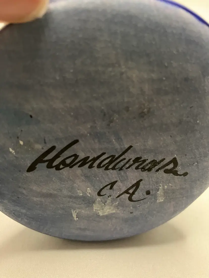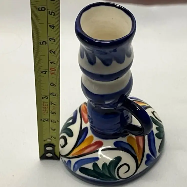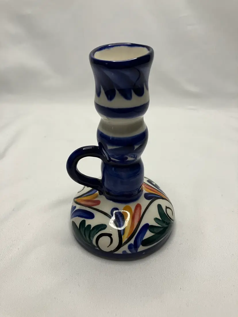 Pretty blue and white hand painted candle stick from Honduras. Signed C.A. No chips or cracks.