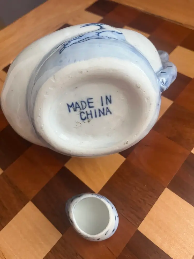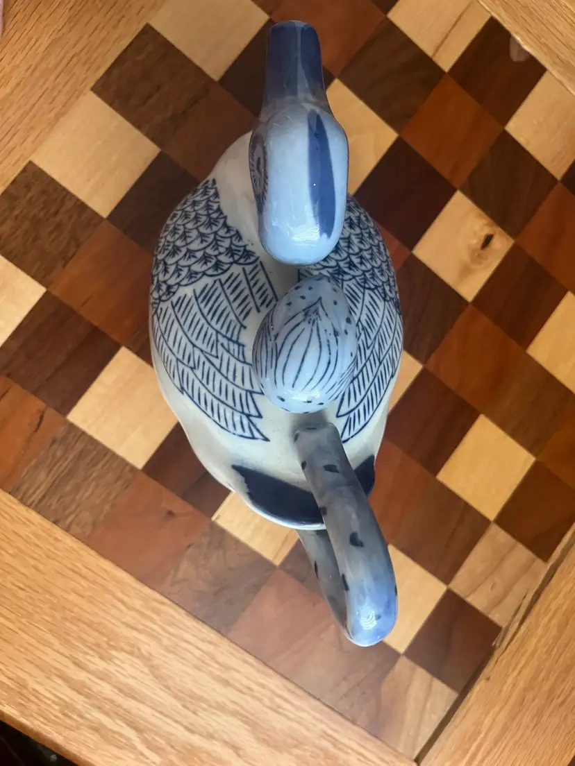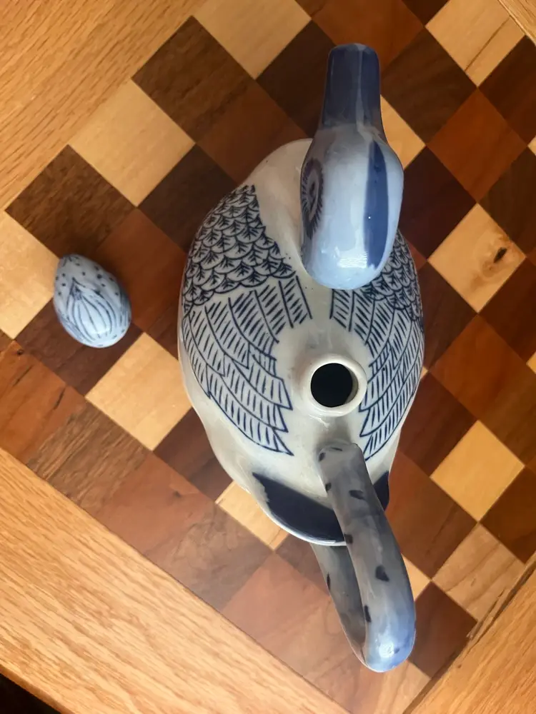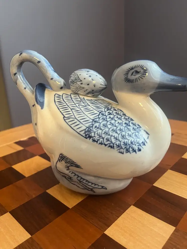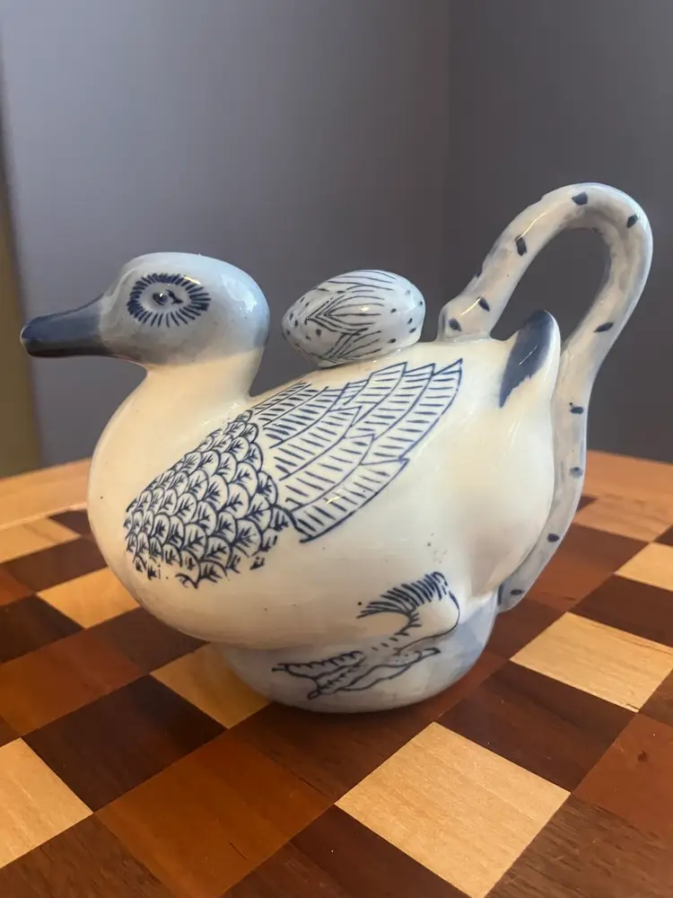 Vintage hand, painted blue and white duck shaped teapot with ceramic stopper-marked made in China - 6” tall No chips or cracks