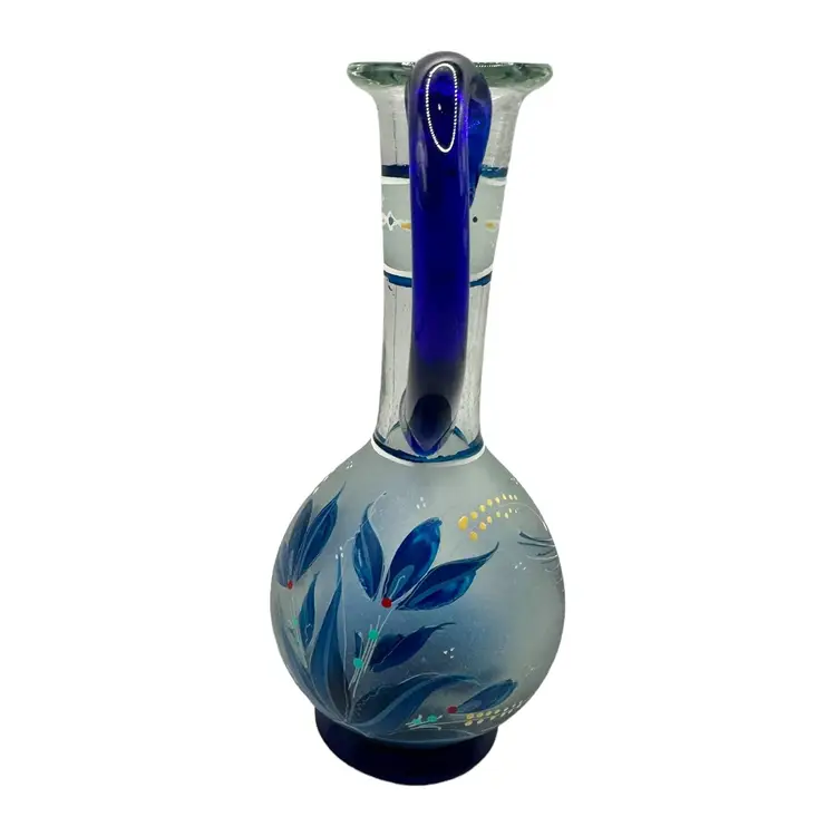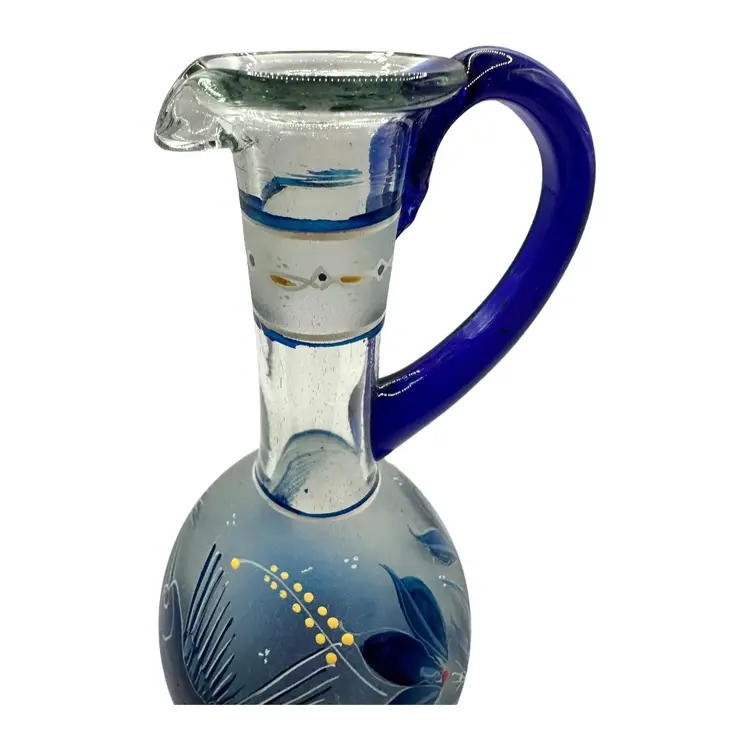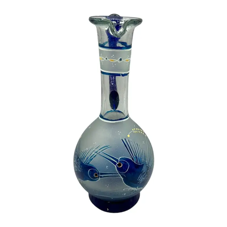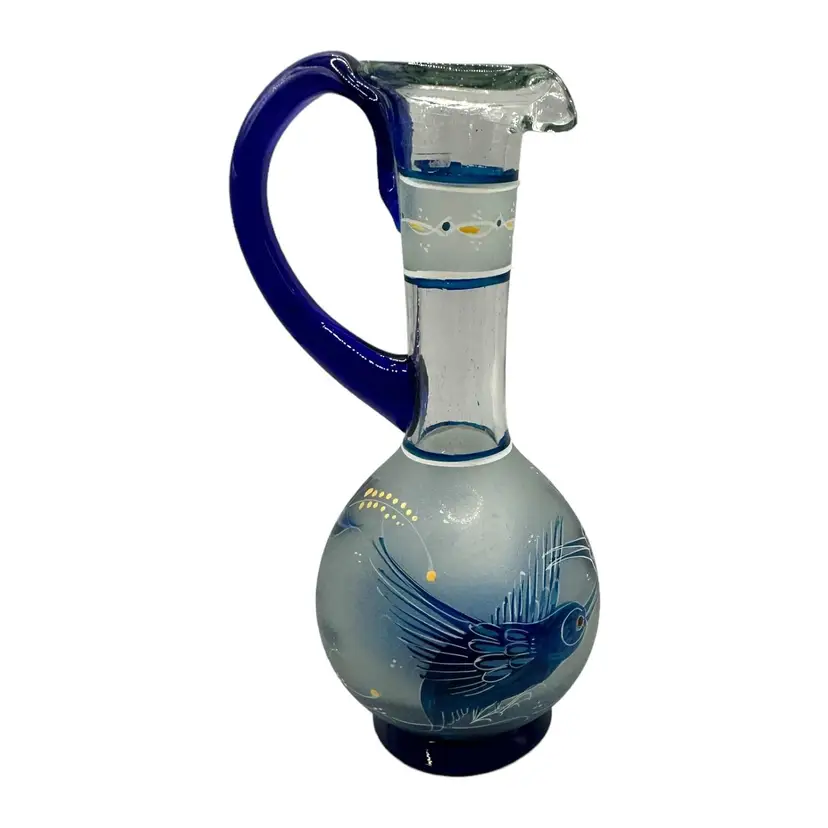 Hand blown and Hand Painted Blue & Yellow Cruet, Bud Vase with Applied blue handle. Hand painted hummingbirds and flowers.in good condition no chips or cracks. Very minor paint wear. 7.25"H x 3.5"D