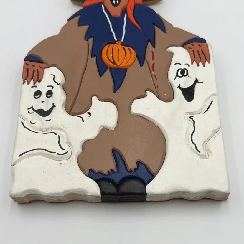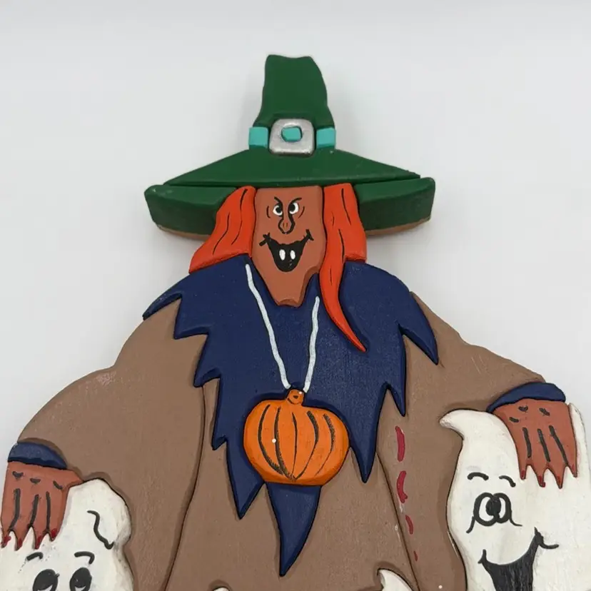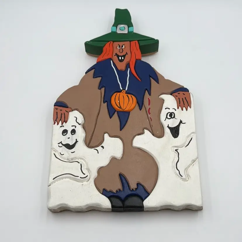 Hand-Painted Carved Wood Witch with Two Ghosts. 9.75” tall and 1” thick.