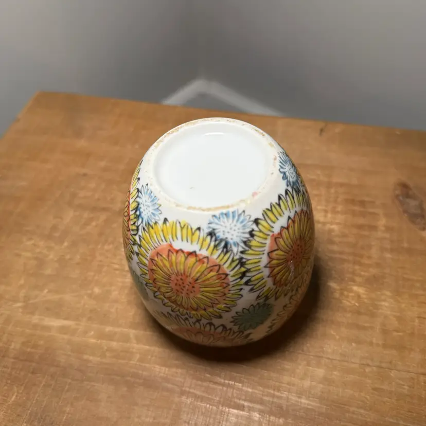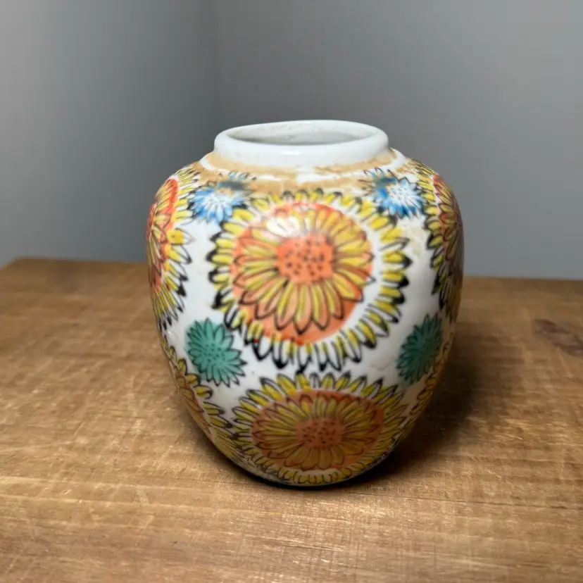 Hand-Painted Ceramic Mini Sunflower Bud Vase. Features a vibrant, all-over floral design with yellow sunflowers and colorful accents. This small, rounded ceramic vase is perfect for single stems or small wildflower arrangements.