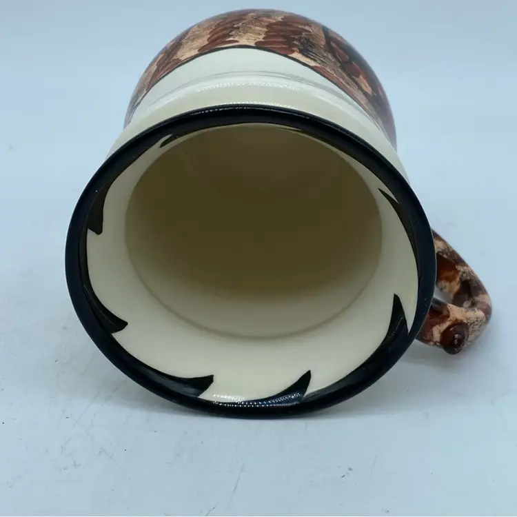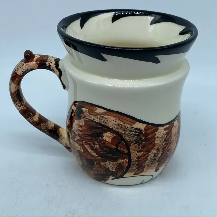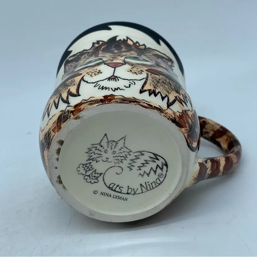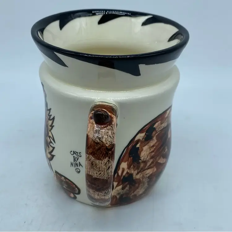 4” x 4.5” No chips or cracks Ceramic mugs featuring animal designs, particularly cats, have been popular decorative and functional items for decades. These pieces often appeal to collectors who appreciate whimsical or artistic representations of animals. The "Cats By Nina" brand is known for its distinctive, often charming, depictions of felines on various ceramic wares.