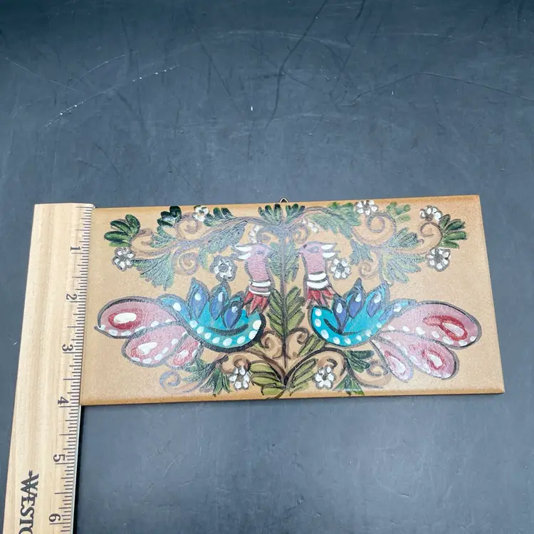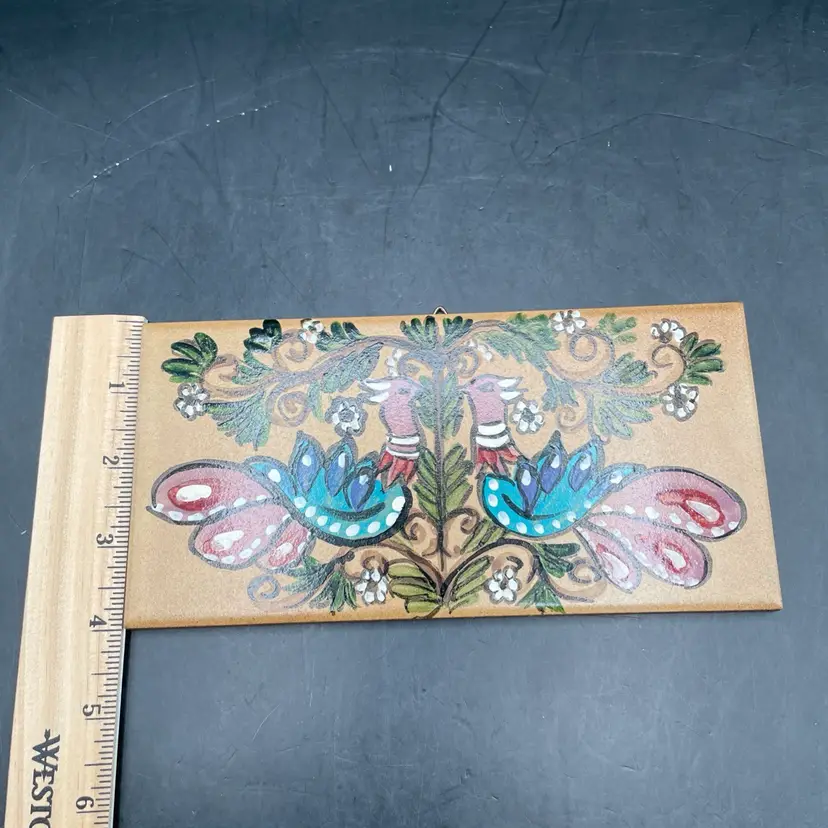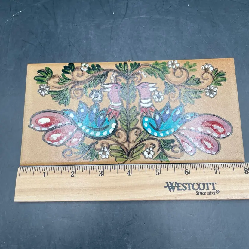 Approximately 8” x 4”. No chips or cracks. It’s got birds on it!