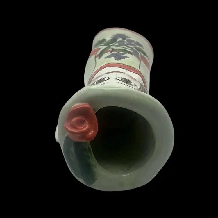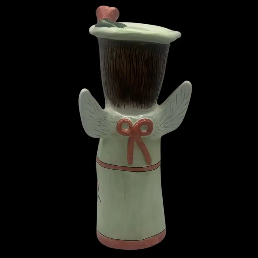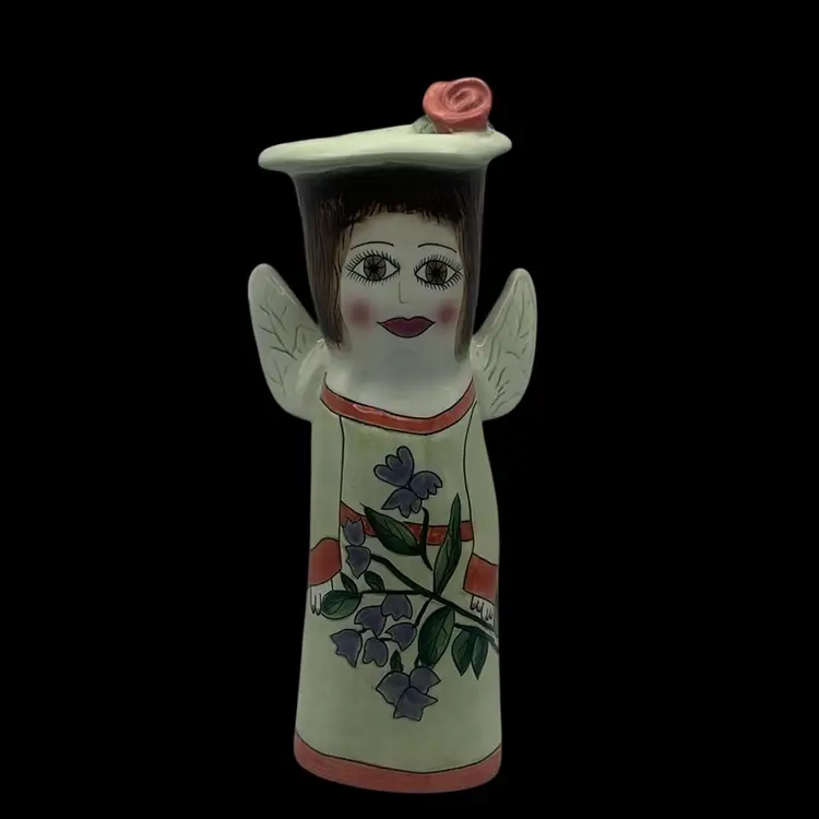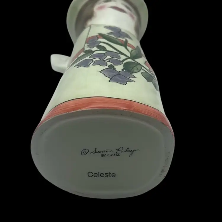 Celeste is wearing a light green dress with a purple motif and flowers. She is also wearing a light green hat with a rose on top of her head. Very good condition.