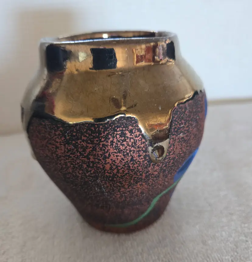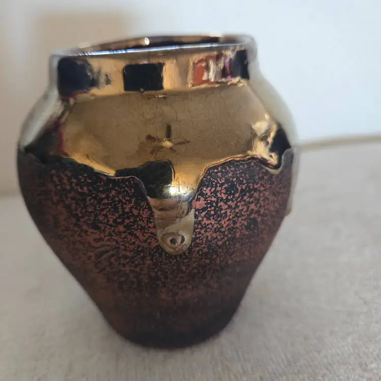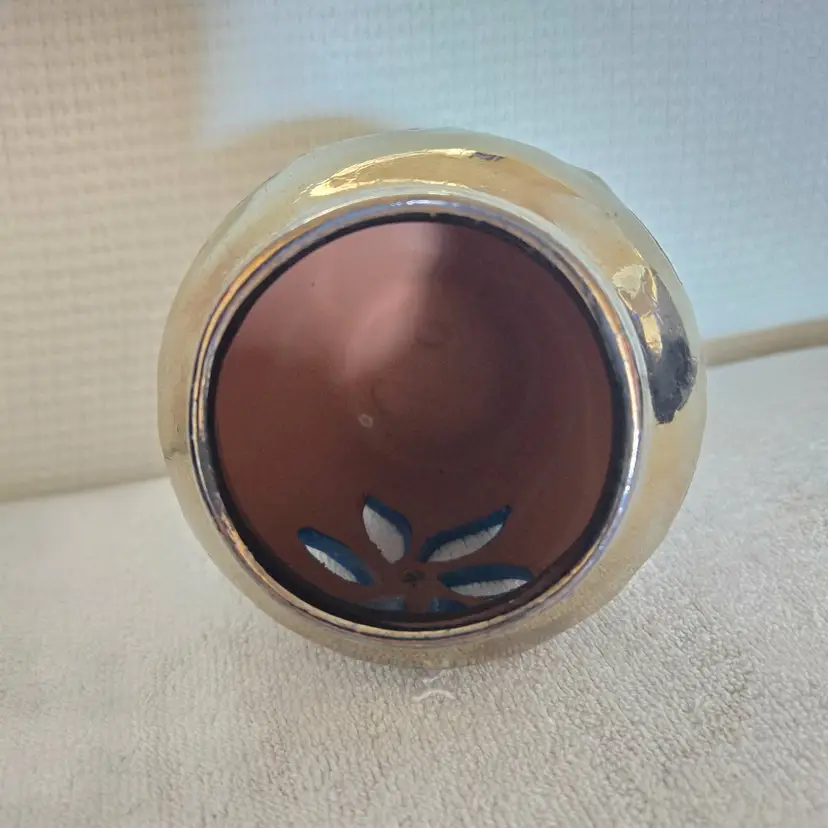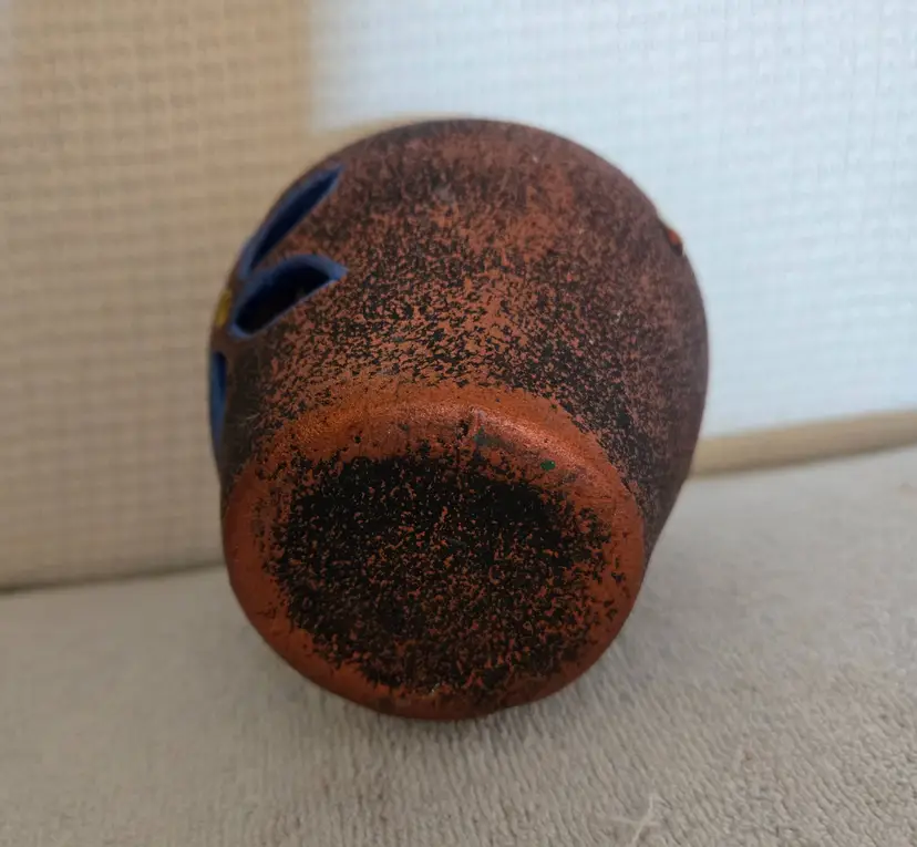 Its designed to hold a votive or tea light candle. It features a textured, speckled finish in earthy tones of brown and gold. It has cut outs shaped like a flower painted in blue with a yellow center. Drip glaze finish on the top and speckled on the bottom. No stickers or signatures. In great condition. Measures 4 3/4" tall, 4 1/4" wide and has a 2 1/2" opening. No chips, cracks, or repairs