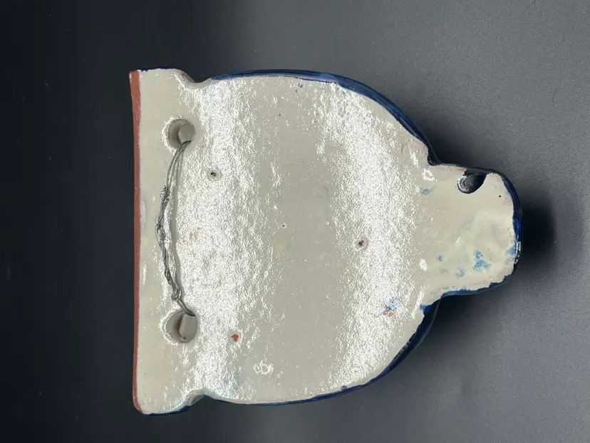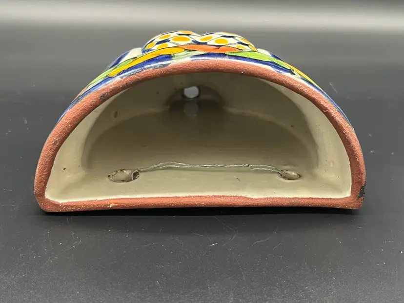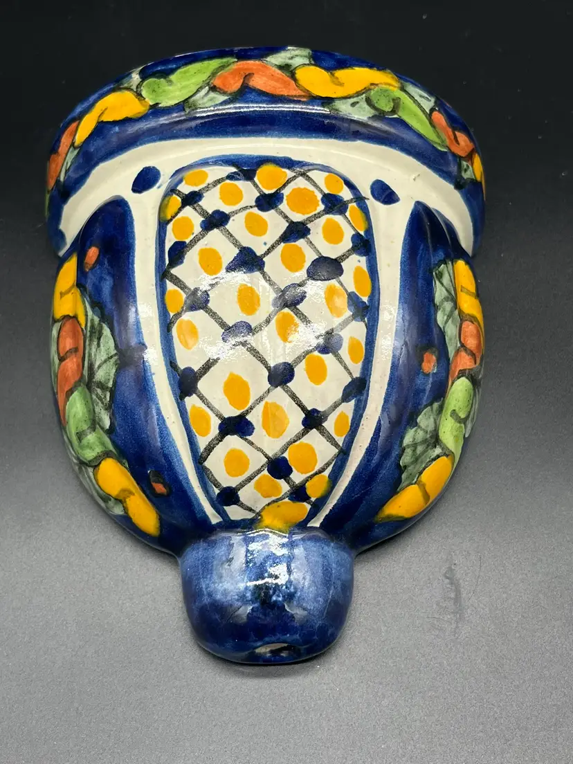 Add a splash of color and charm to your wall with this hand-painted ceramic wall pocket, bursting with vibrant folk-art energy. Featuring a rich cobalt blue base adorned with citrus-toned florals and lattice-style center, this piece evokes vintage Mexican or Mediterranean pottery traditions. The glossy glaze and bold palette make it a standout accent for boho, cottagecore or eclectic interiors. Perfect for holding dried flowers, herbs or simply as a decorative statement. Ideal for collectors of global ceramics or lovers of joyful design. Shipping included. Glazed ceramic. 5.5" tall, 5" wide and 3" deep. Excellent condition, no chips or cracks.
