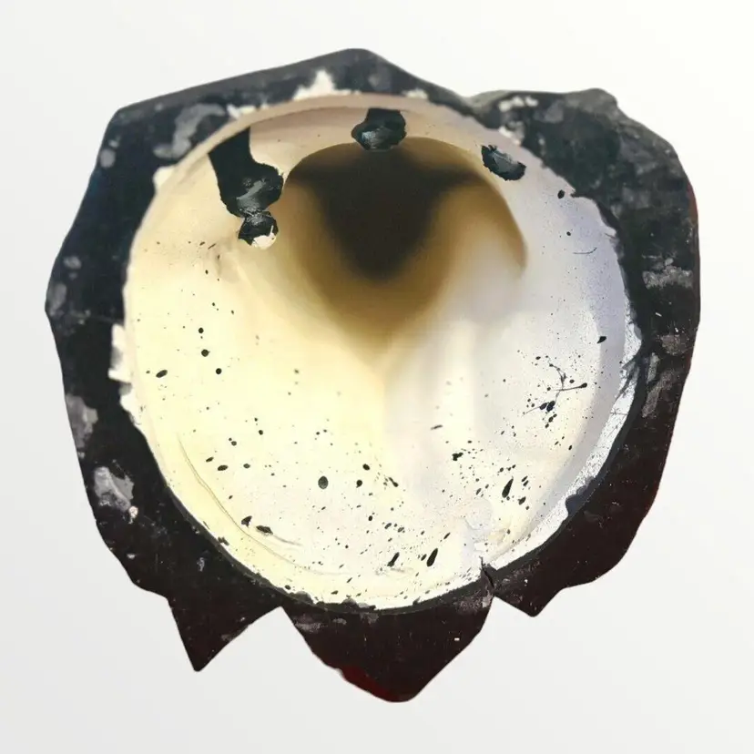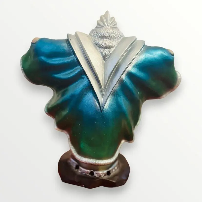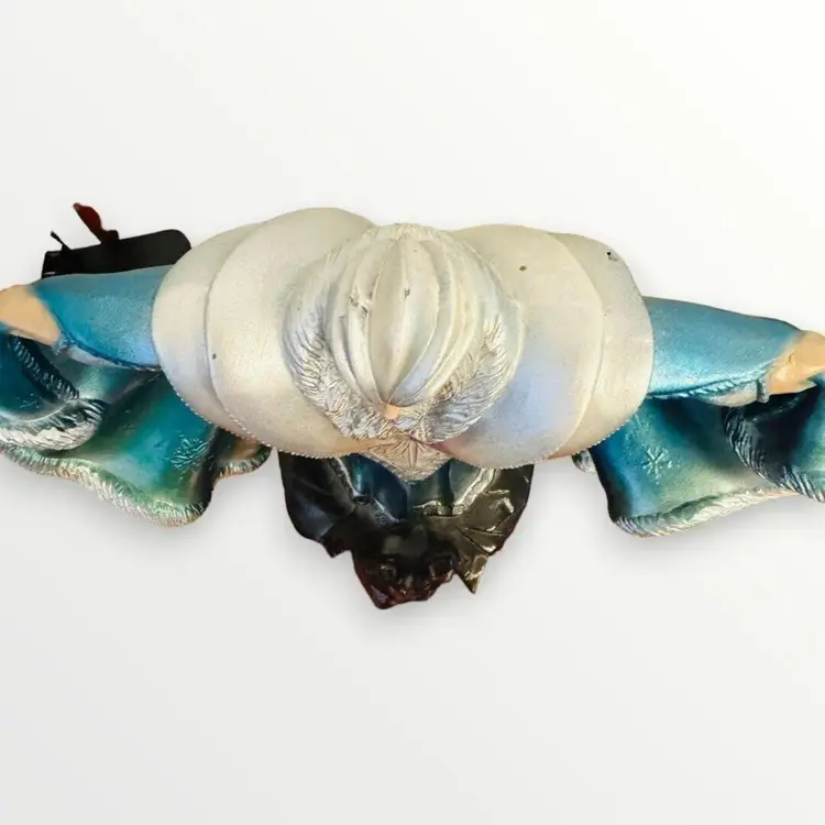 Awesome vintage hand painted ceramic Wizard. Approximately 10 inches tall. You could sit a little crystal on the black pedestal in front of him. He has two round holes under his cape, I'm not sure if he may have had a staff at one point that you stuck through there but it has been lost through the years. There are also 3 round holes in the back. Not sure what they are for. He appears hand painted in a blue/gray gradient. Some very minor paint rub and some scuffing on the bottom. This wizard weighs over 2lbs! He will be shipped double boxed to ensure he arrives at this destination safely.