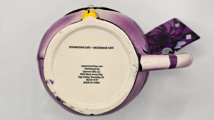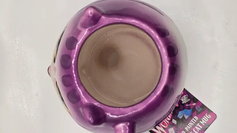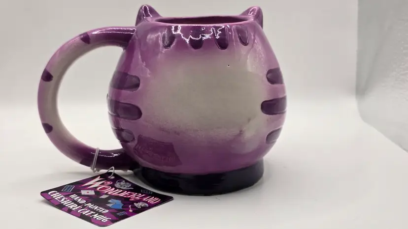 This adorable hand-painted Cheshire Cat mug from the Wonderland collection is full of personality—bright yellow eyes, a mischievous grin, and that classic purple striped tail handle. It still has the original tag attached and is dishwasher and microwave safe, making it both fun and functional.