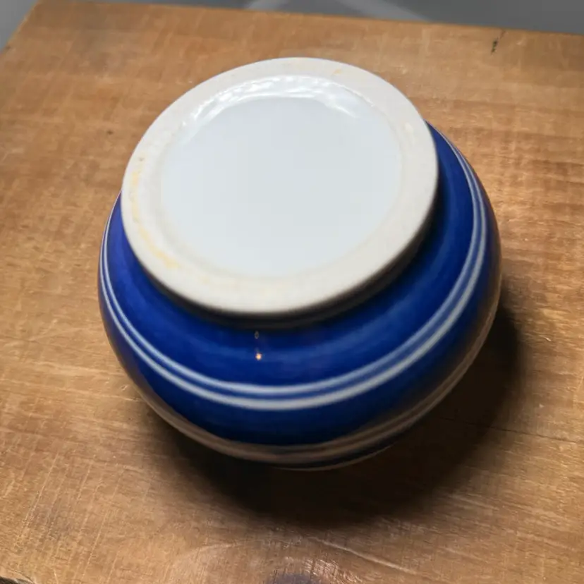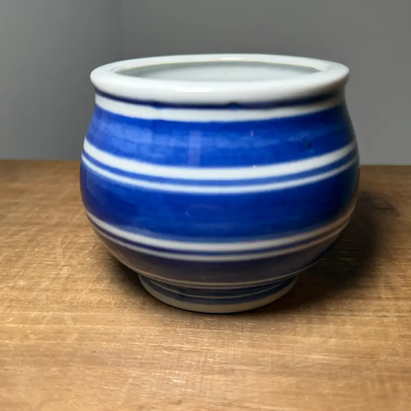 Hand-Painted Cobalt Blue and White Striped Ceramic planter. This charming decorative piece features vibrant cobalt blue horizontal stripes over a clean white ceramic base, indicating a handcrafted quality with unique variations in glaze.