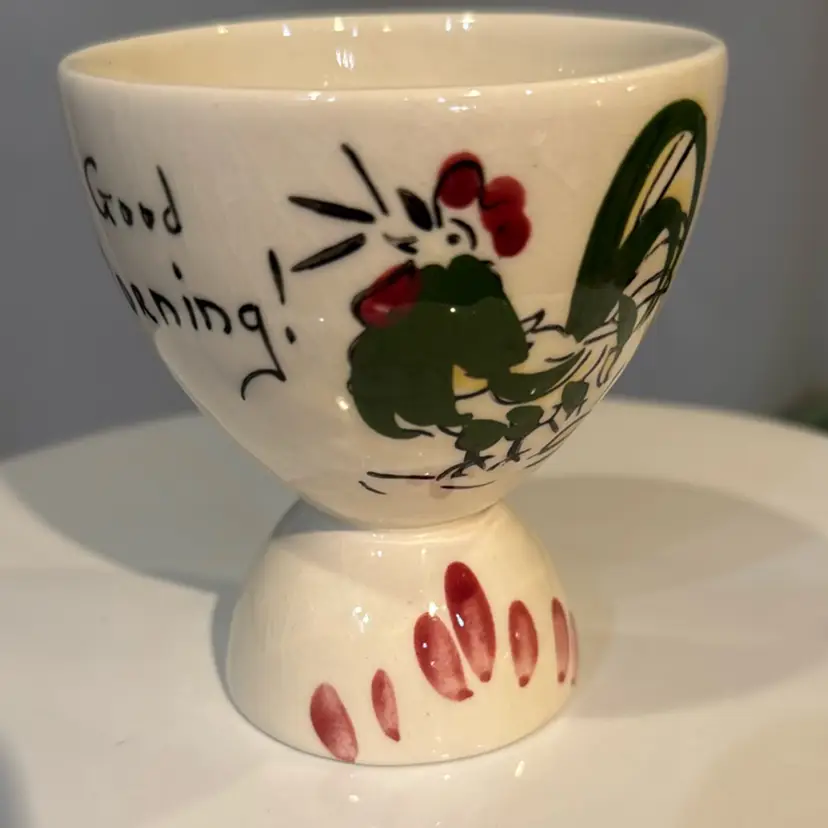Cute vintage rooster double egg cup. Measures three and three-quarter inches tall by 3 1/4 inches at its wide dust.