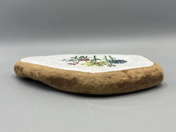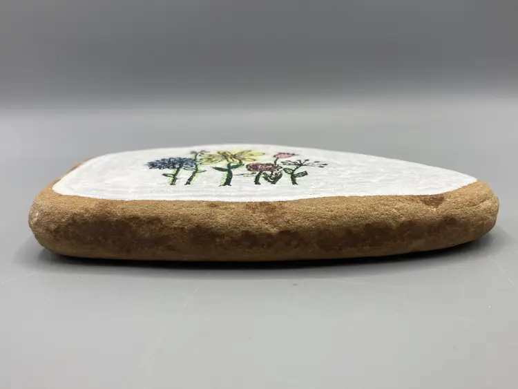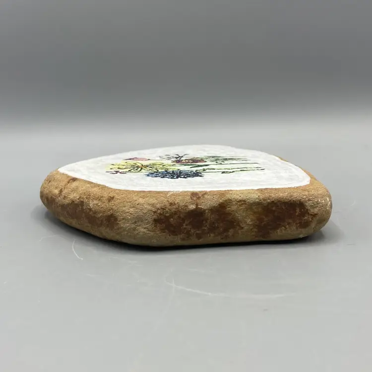 This hand painted rock is in great condition. The floral design is perfect for spring. The rock measures approximately 6" across, 4 1/2" tall, and 3/4" thick.
