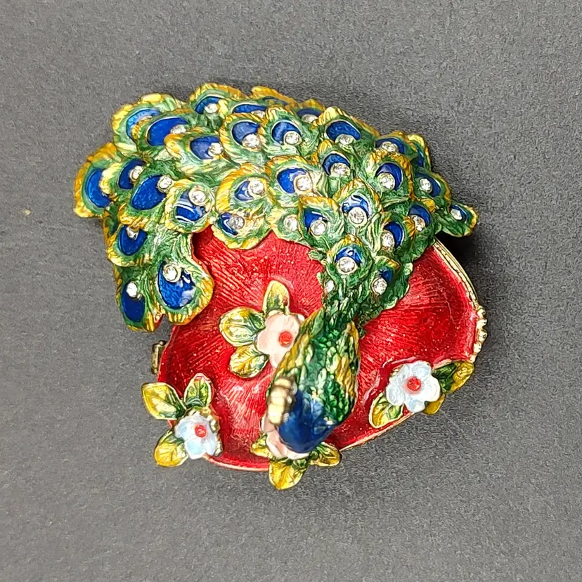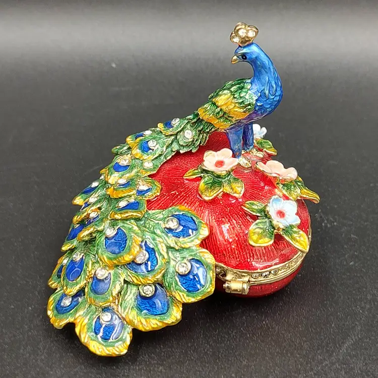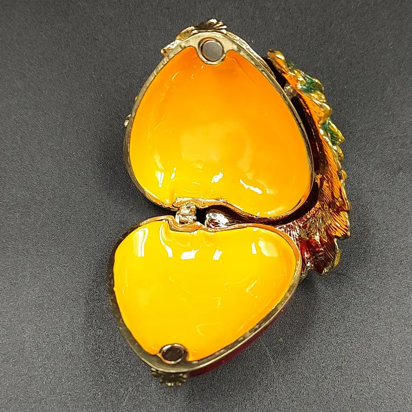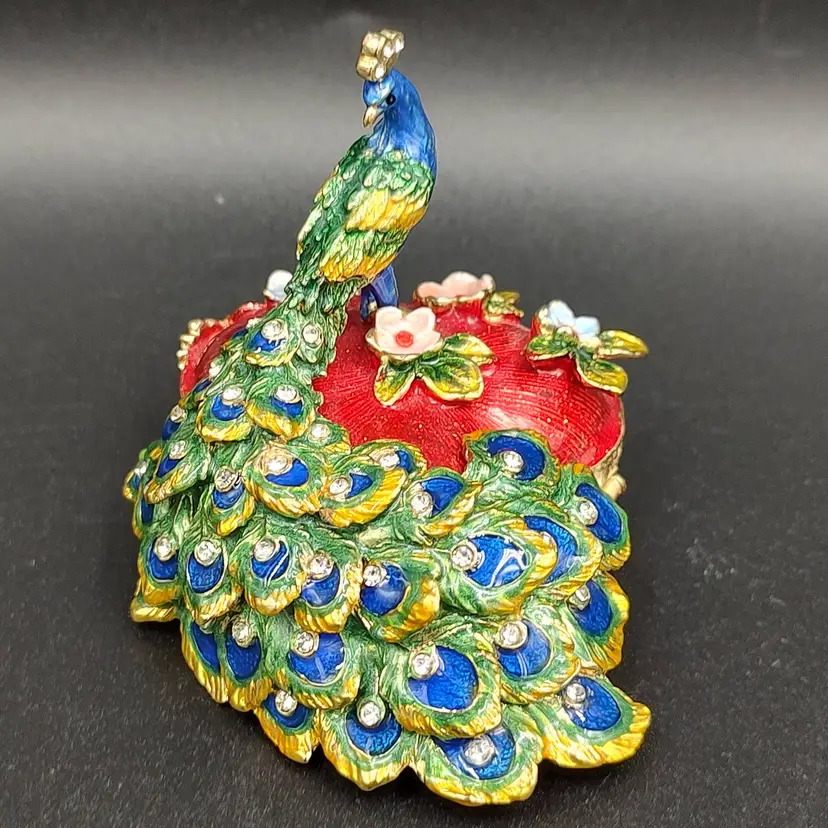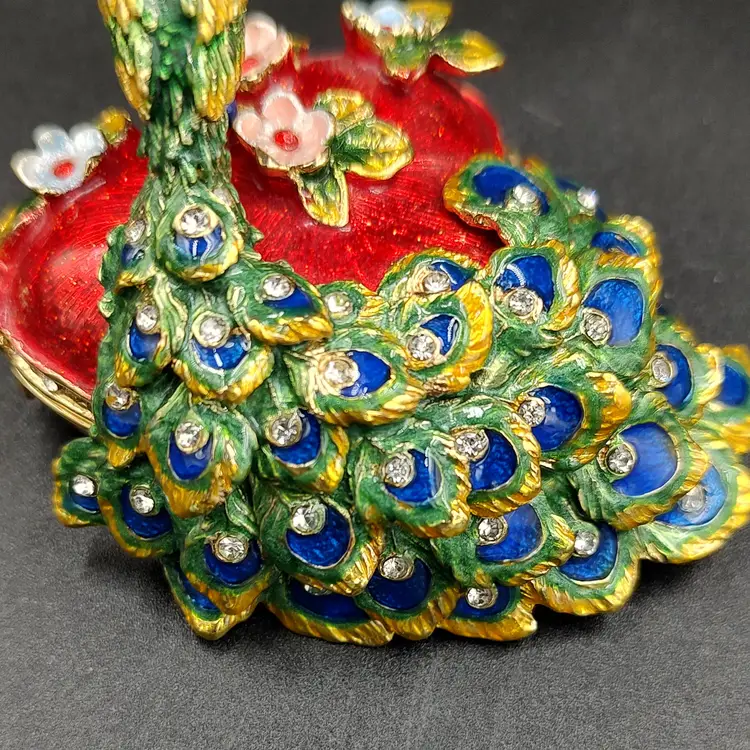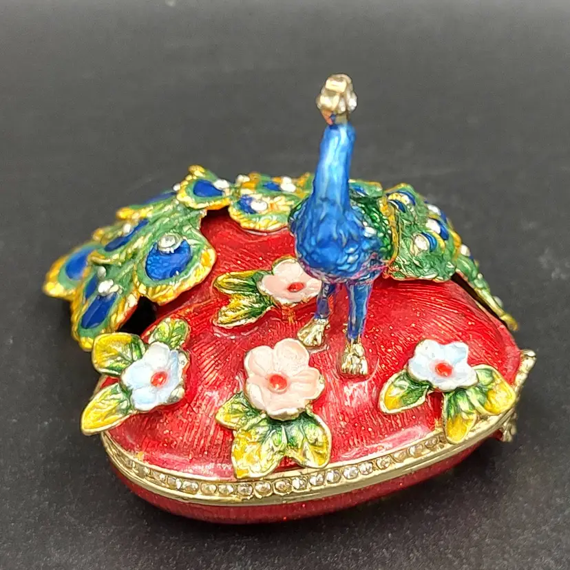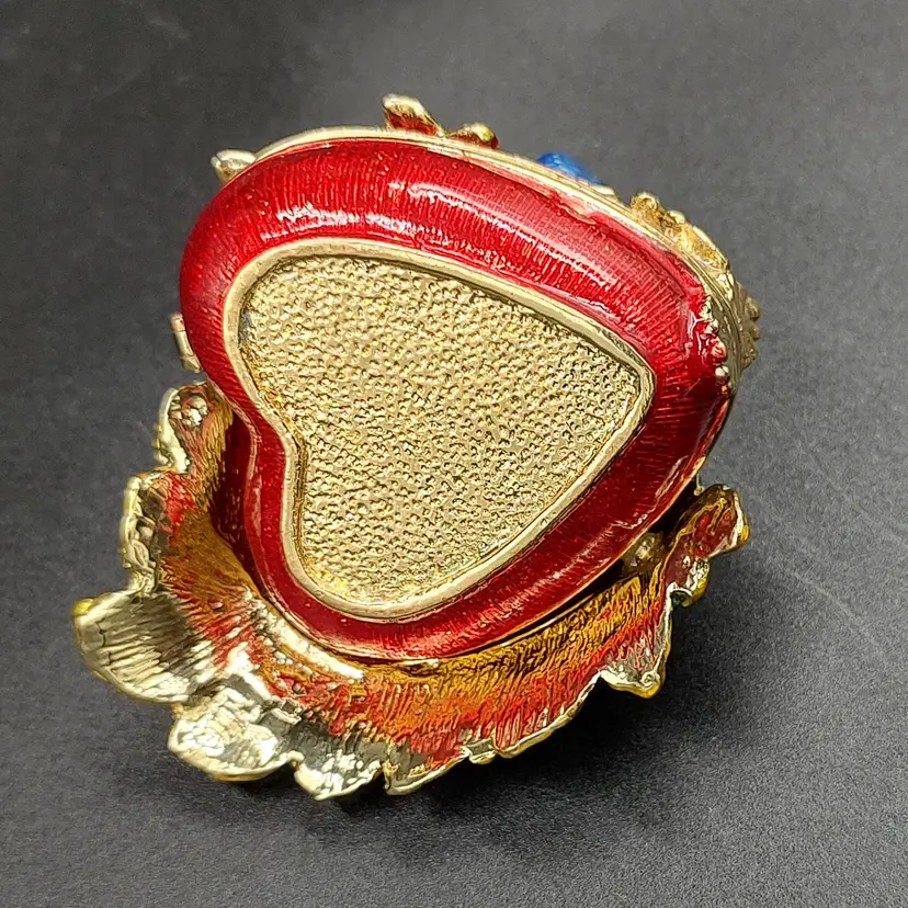Hand Painted Enamel Heart Shaped Jeweled Trinket Box. Made from high quality alloy adorn with rhinestone magnetic lid. Height 2" x width 2.5" x length 2.5".