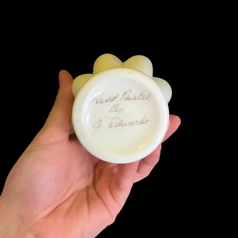 No chips or cracks. Approximately 6.25” x 4” x 4”. Hand painted and signed J. Edwards.