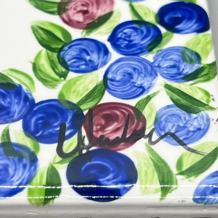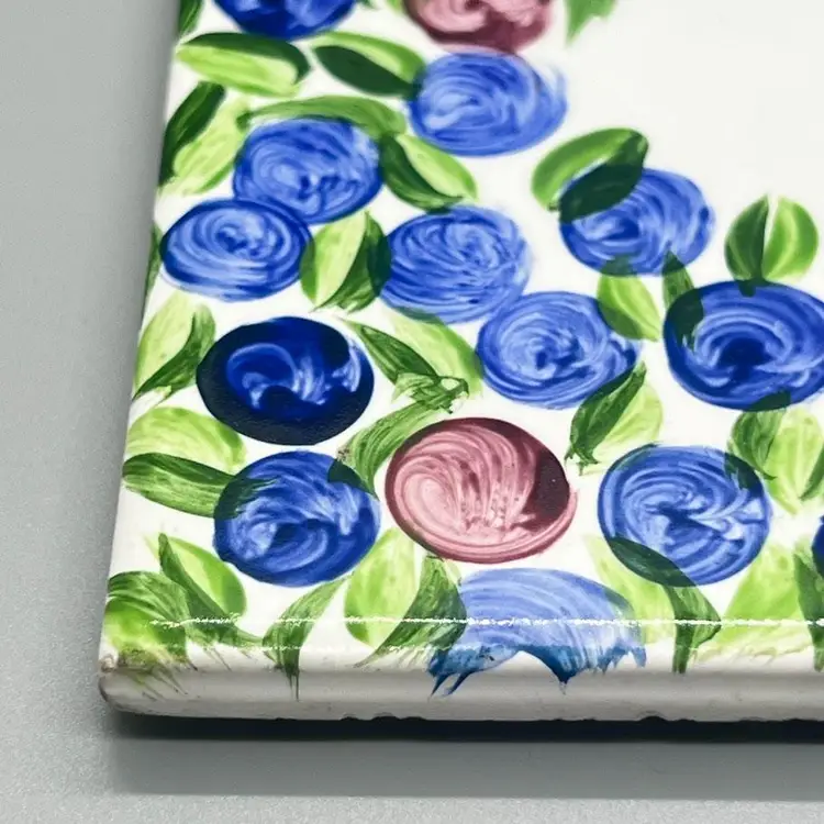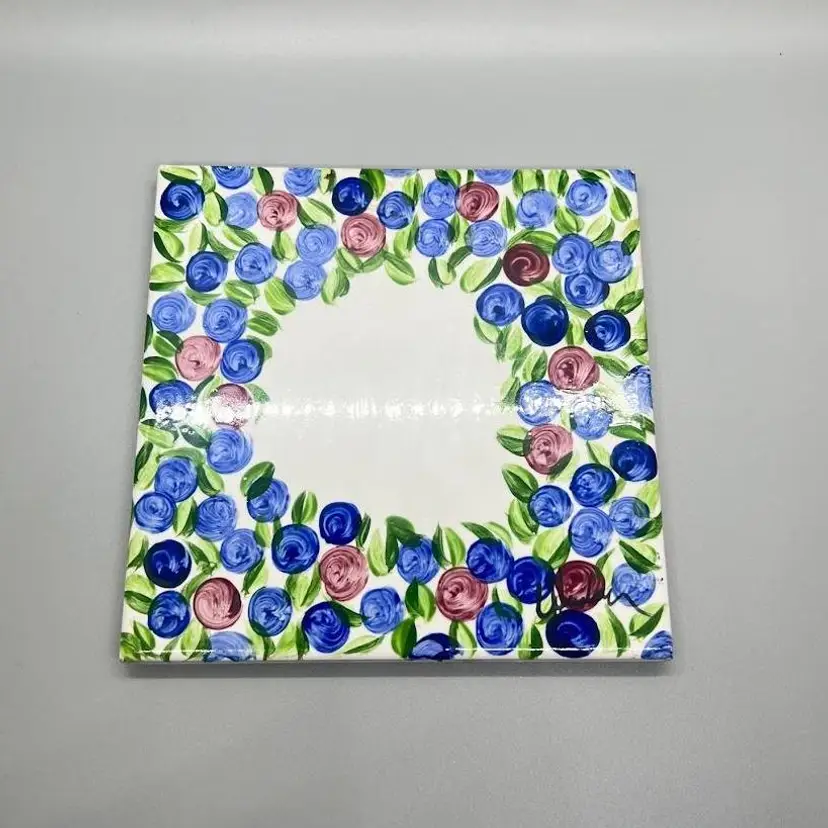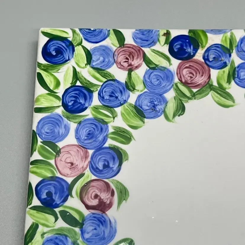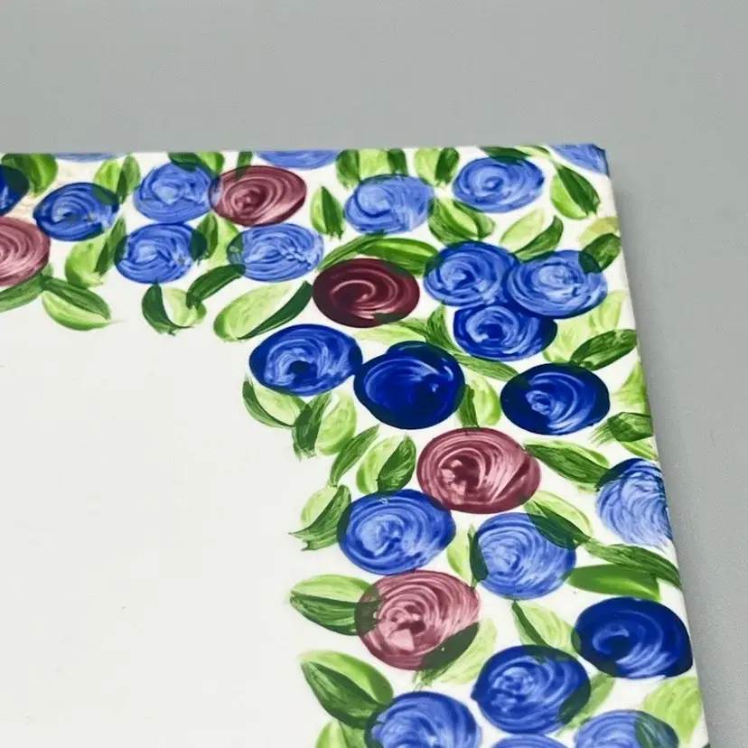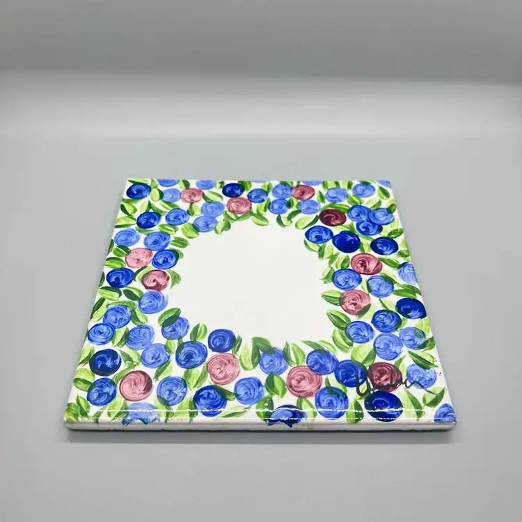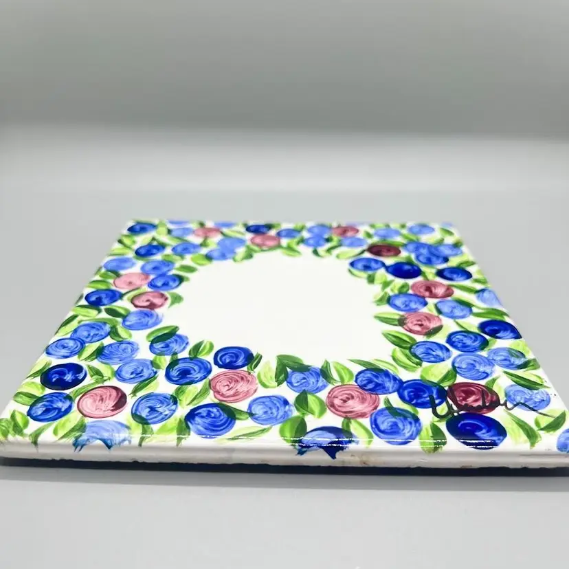 Brighten up your space with this charming hand-painted ceramic tile featuring a vibrant floral design. Perfect for use as a decorative piece or as a unique trivet, this tile adds a touch of artistry to any room. 6" Long x 6" Wide