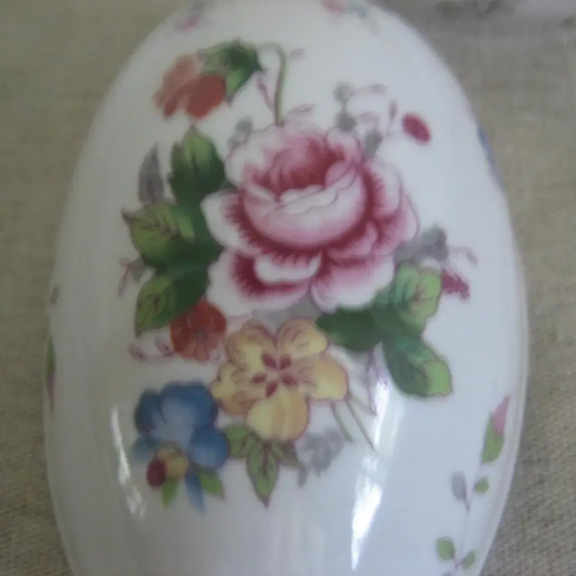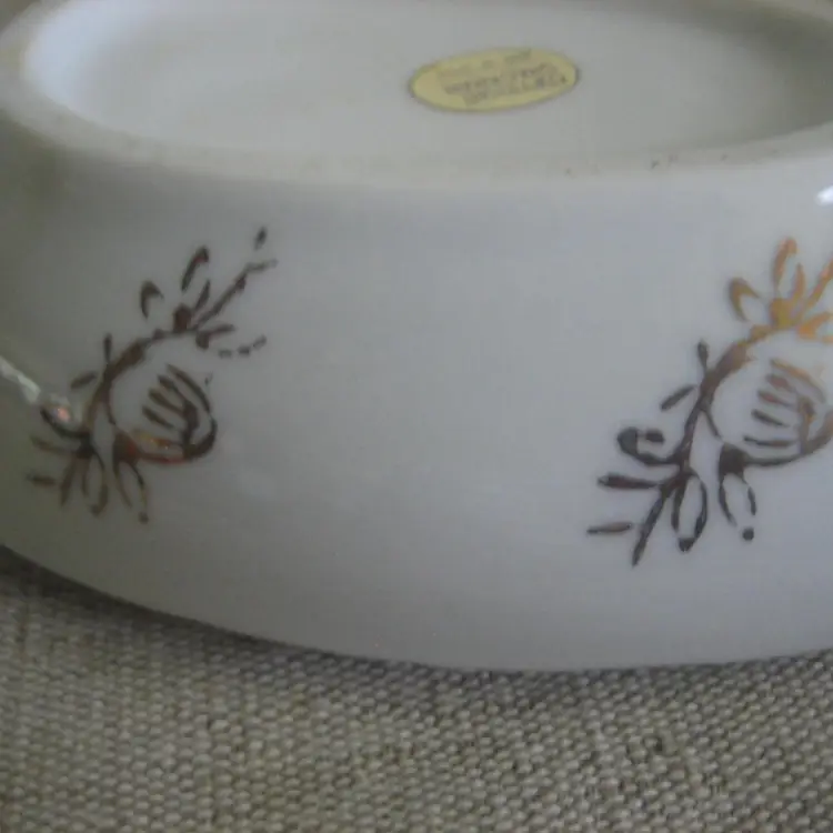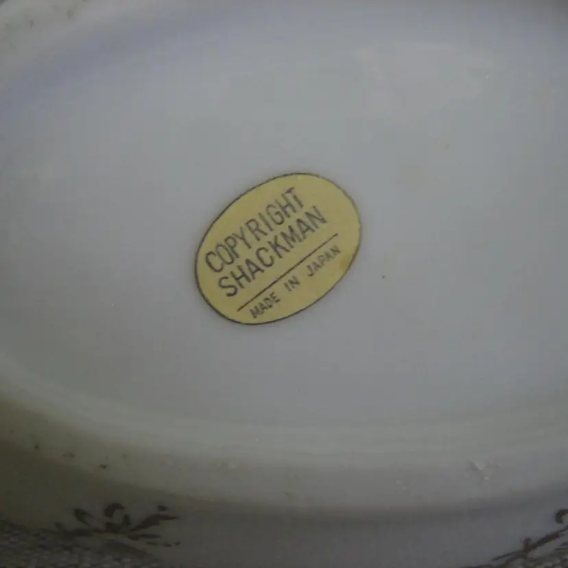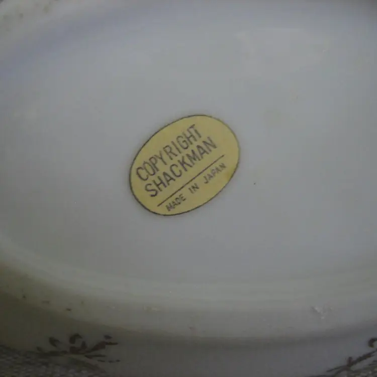 Multi color transfer-ware with flowers adorning the trinket box. It has gold accents and gold trim. The label is still attaced to the bottom and says Copyright Shackman - Made in Japan.
