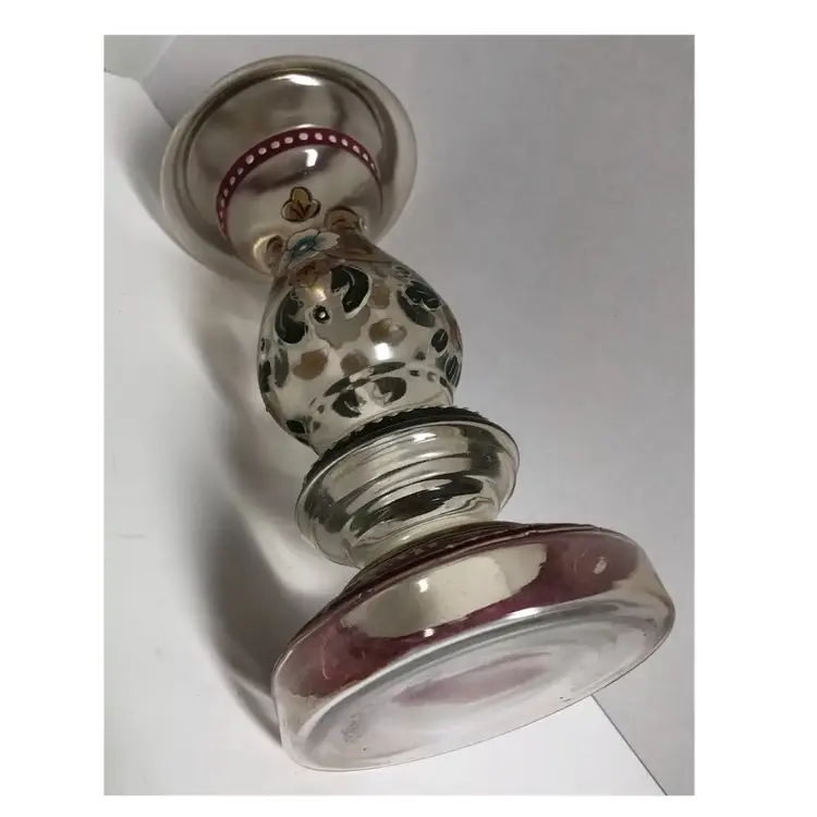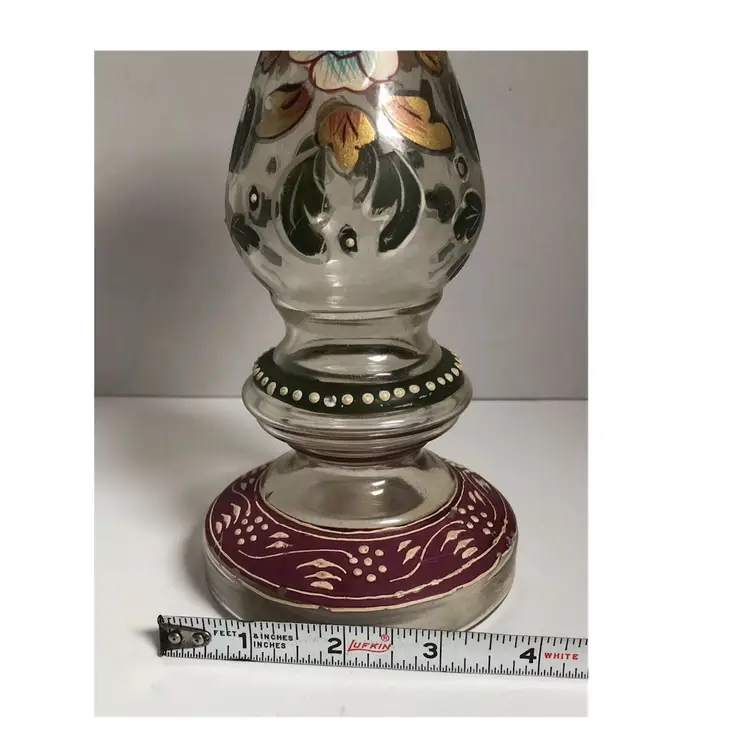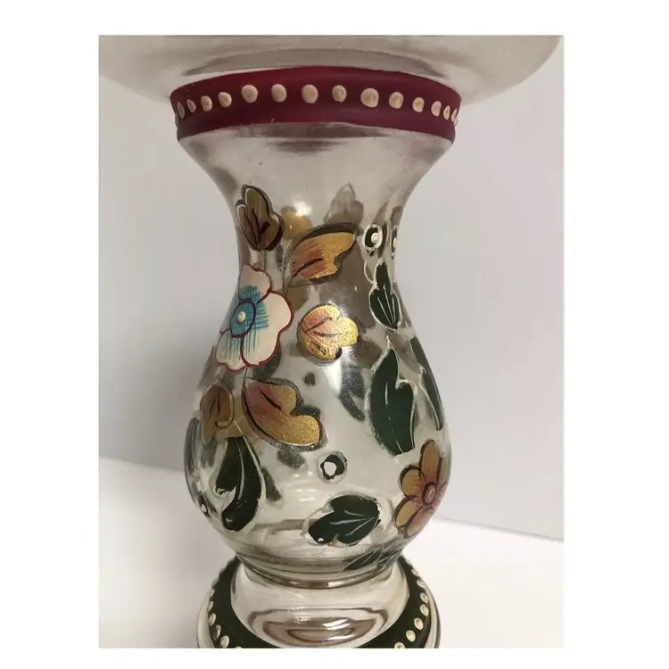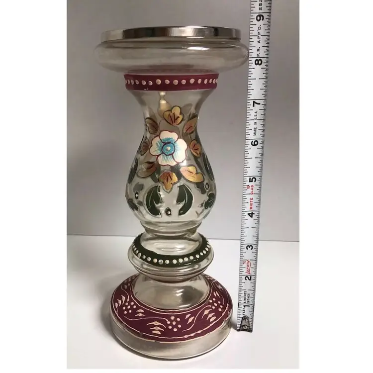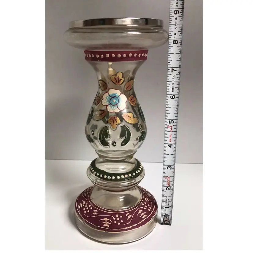This is a stunning hand painted candle holder with multiple color variations and floral patterns. It’s in good condition with no chips, cracks or flakes.