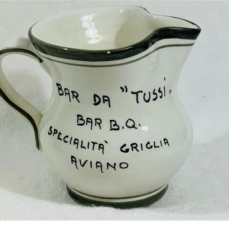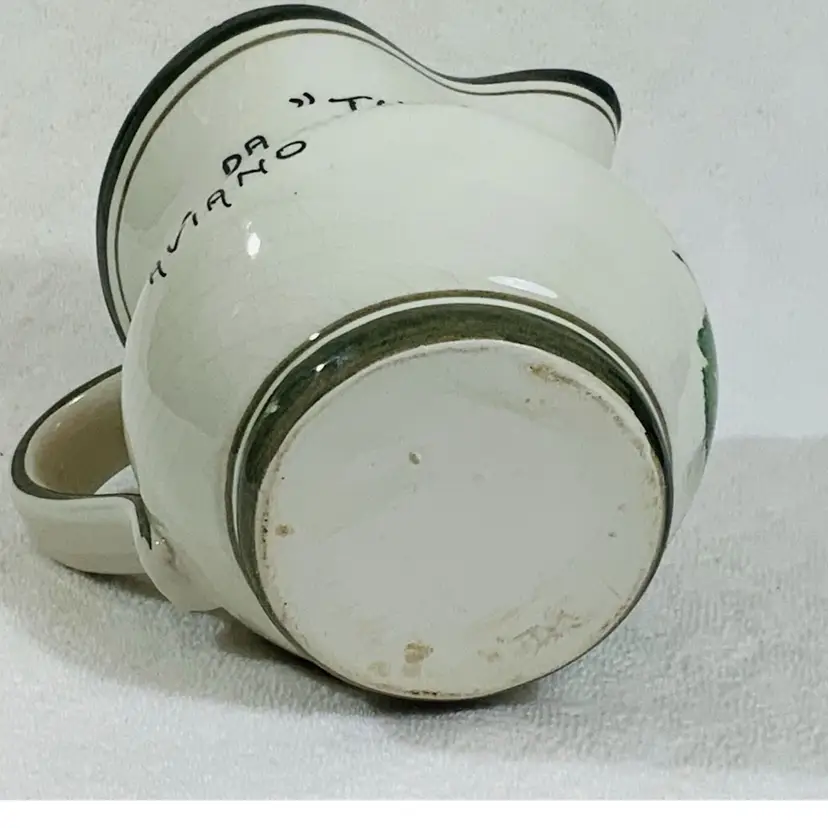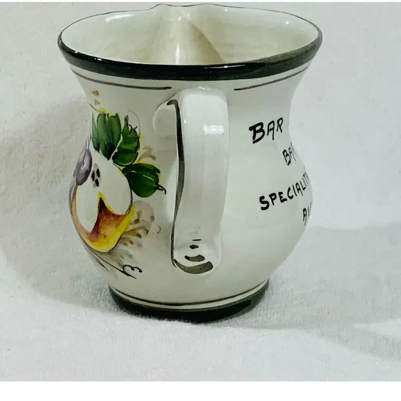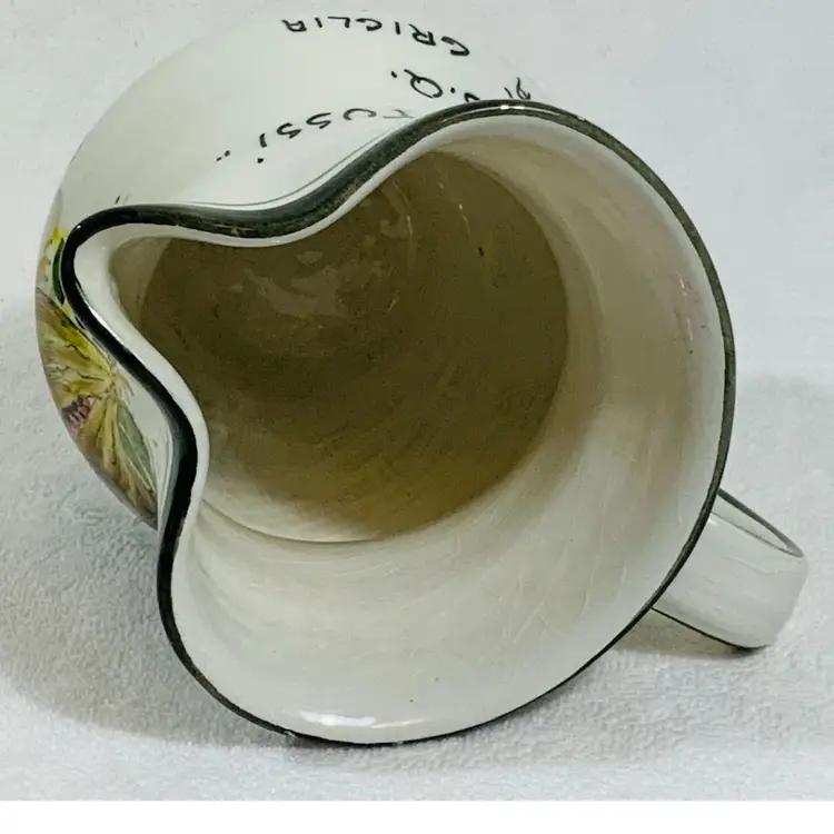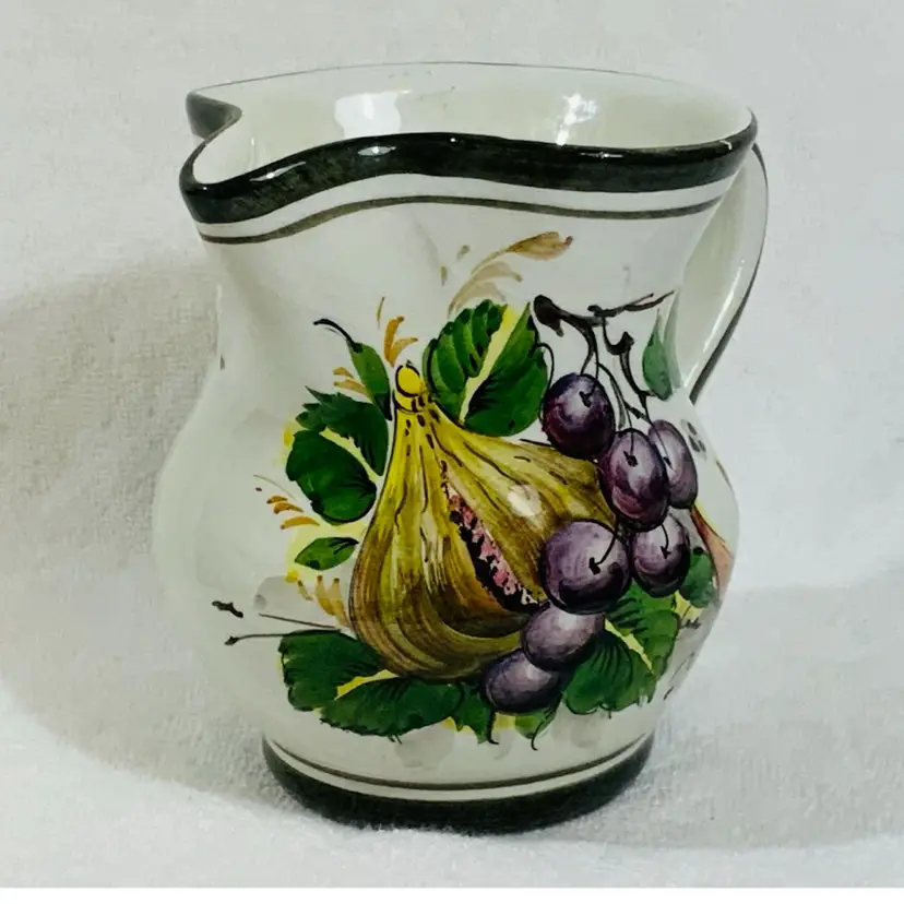 Darling floral jar pitcher. 5” tall with 6” wide. A couple of flea bites on rim, as photographed. Otherwise in good condition.
