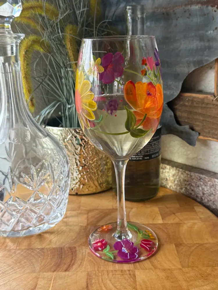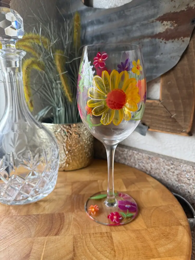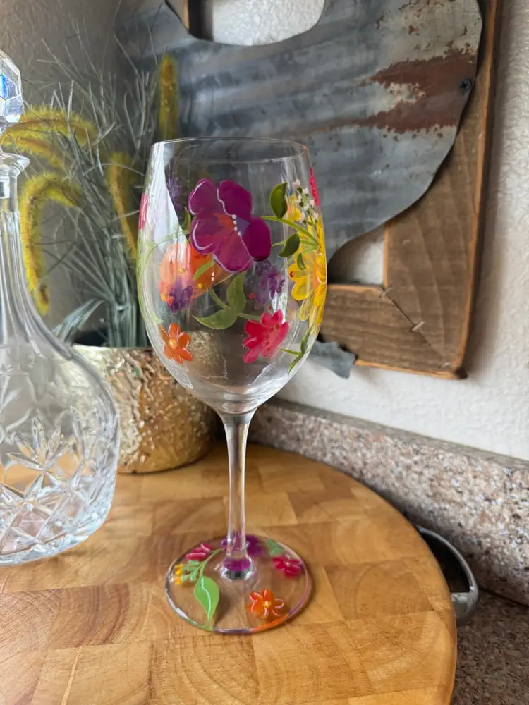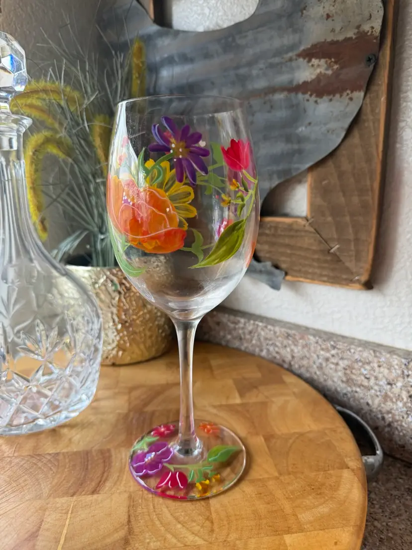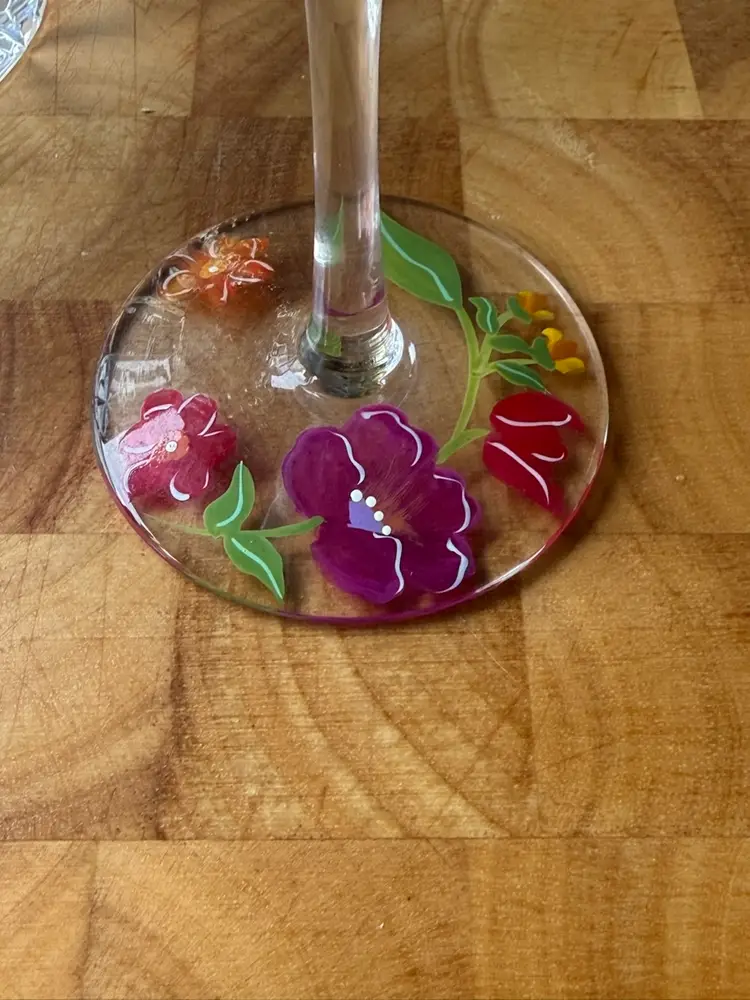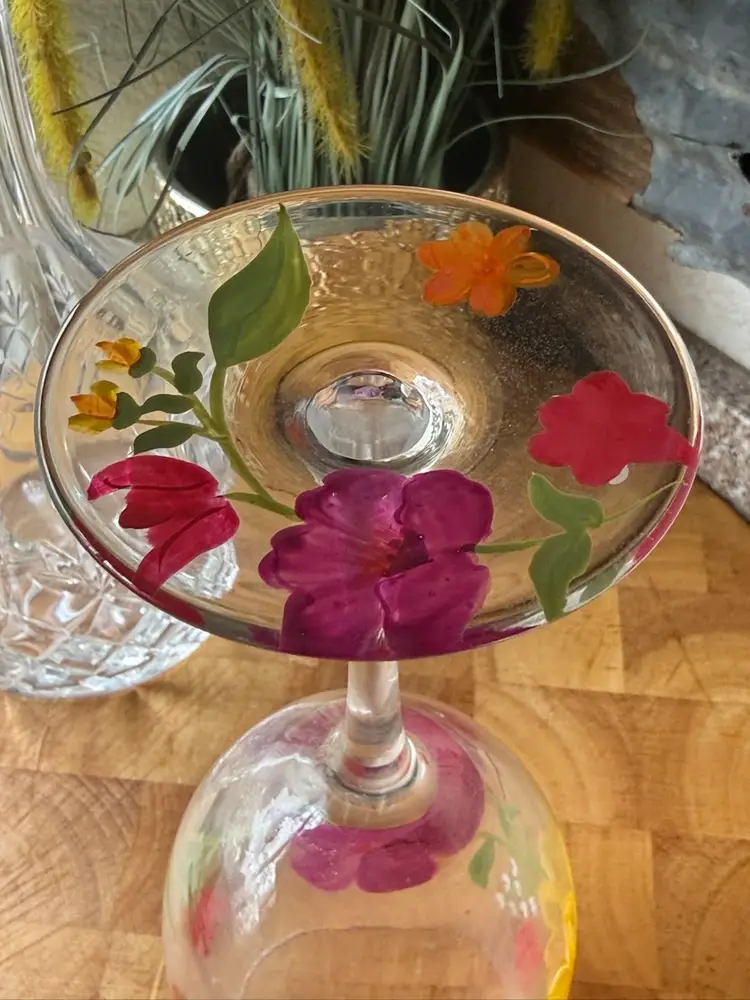 📏 Details (clean + sellable) • Height: approx. 8.5–9 inches • Capacity: approx. 10–12 oz • Material: clear glass with hand-painted floral design • Design wraps around bowl and base (super eye-catching) • Condition: Excellent • No chips or cracks observed • Paint is vibrant and intact