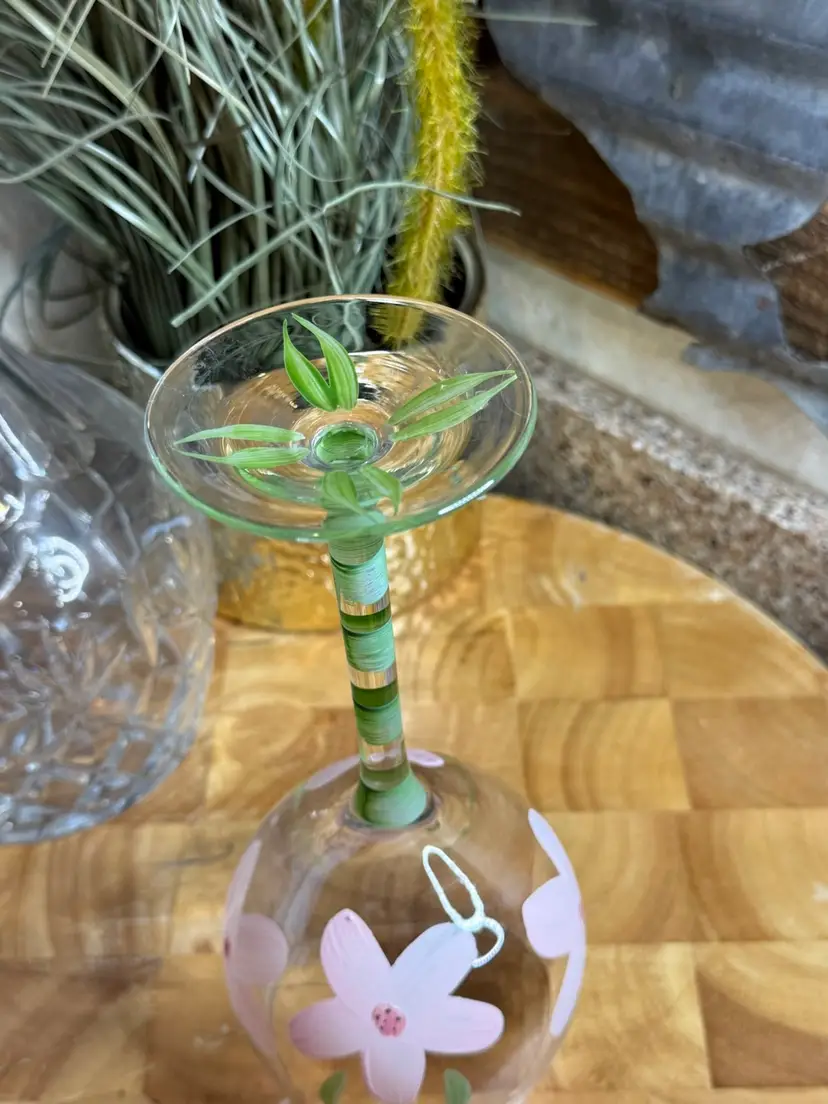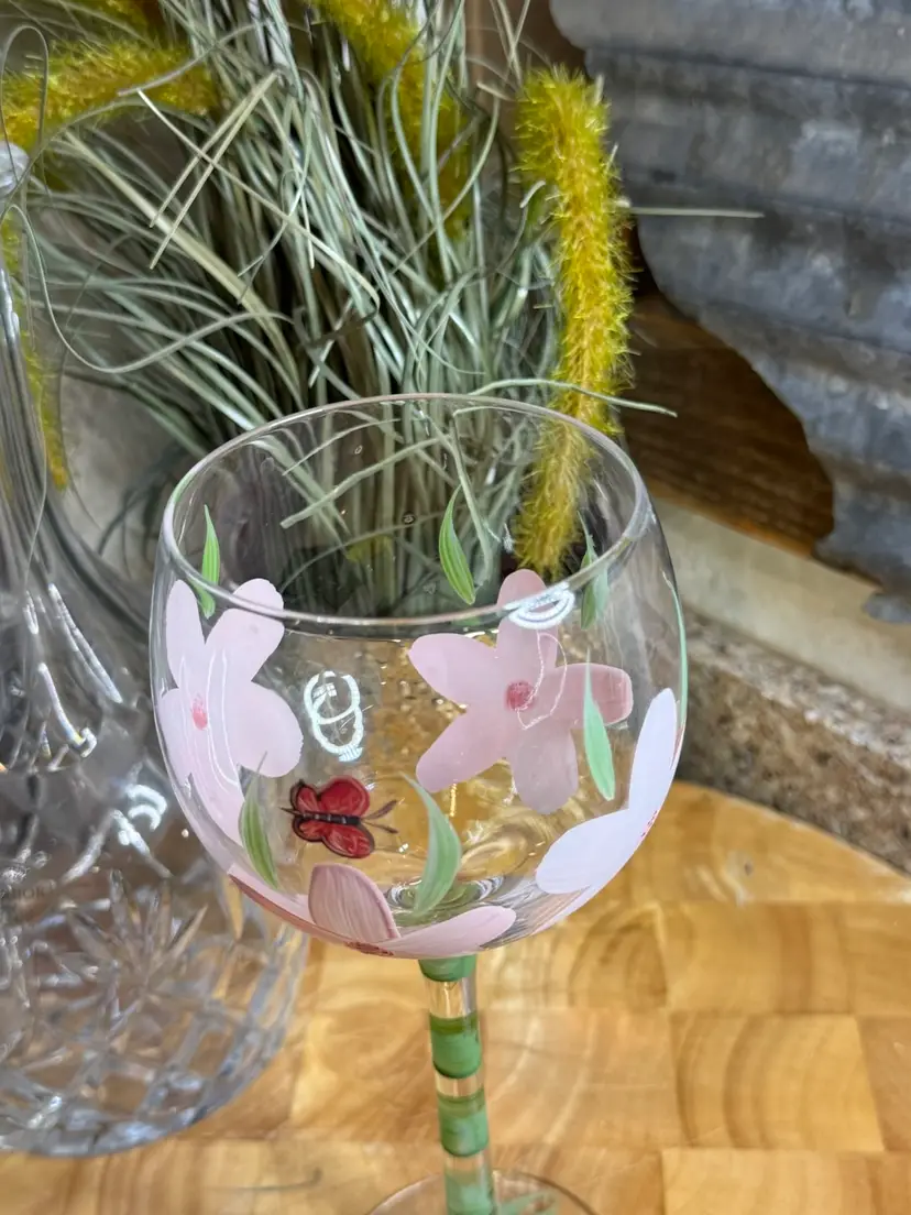 Hand-painted with soft blossoms and a tiny wandering ladybug, this glass was said to appear only when the moment felt just right. Not for crowds, not for noise—but for quiet toasts, soft laughter, and evenings that felt like they might linger forever.
