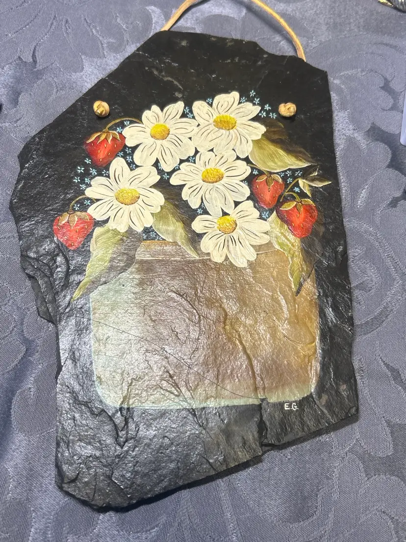 Notable Details • Hand painted folk art design • Natural slate substrate with irregular edges • Daisies and strawberries motif • Rustic cottage / farmhouse aesthetic • Cord hanger attached for wall display • Signed “E.G.” in lower corner