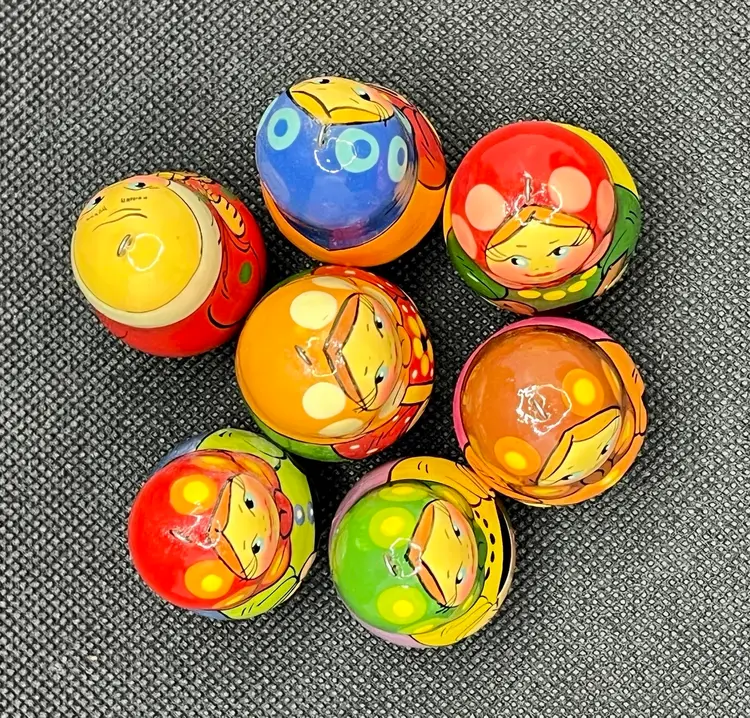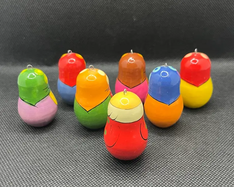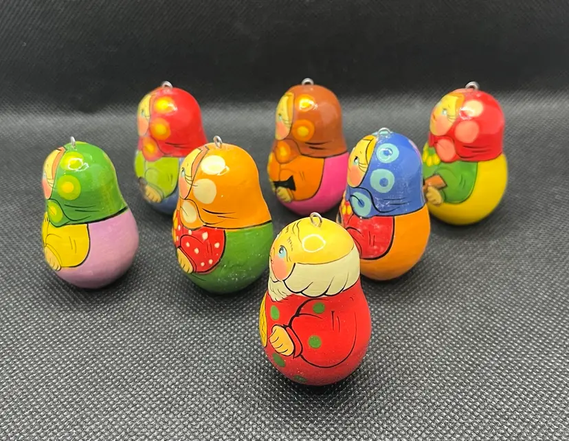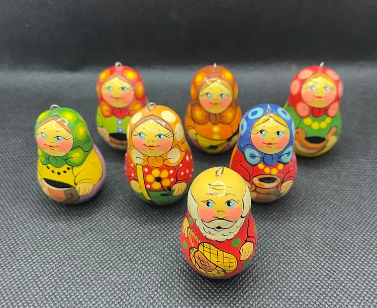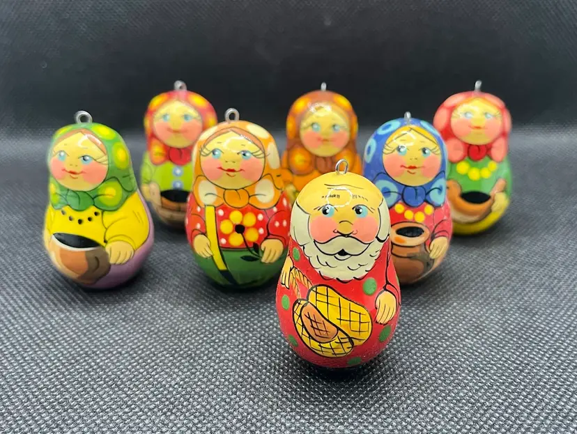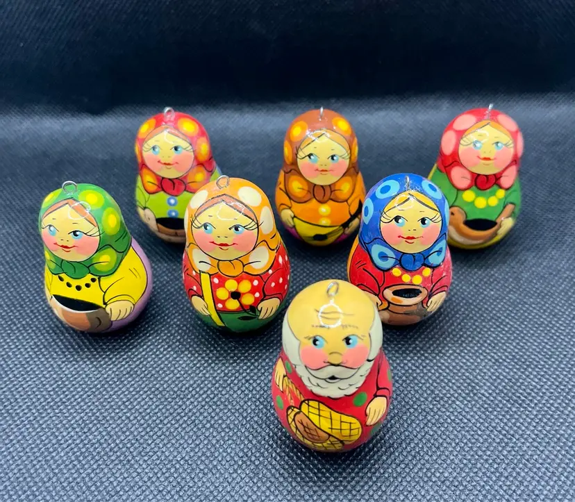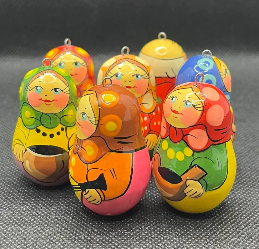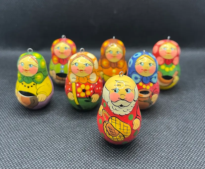 These are hand-painted wooden Russian matryoshka nesting doll Christmas ornaments. EUC with only minor surface wear. Set of 7 ornaments. Slightly under 2” tall.