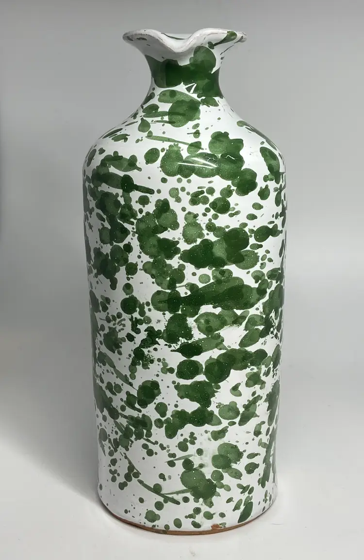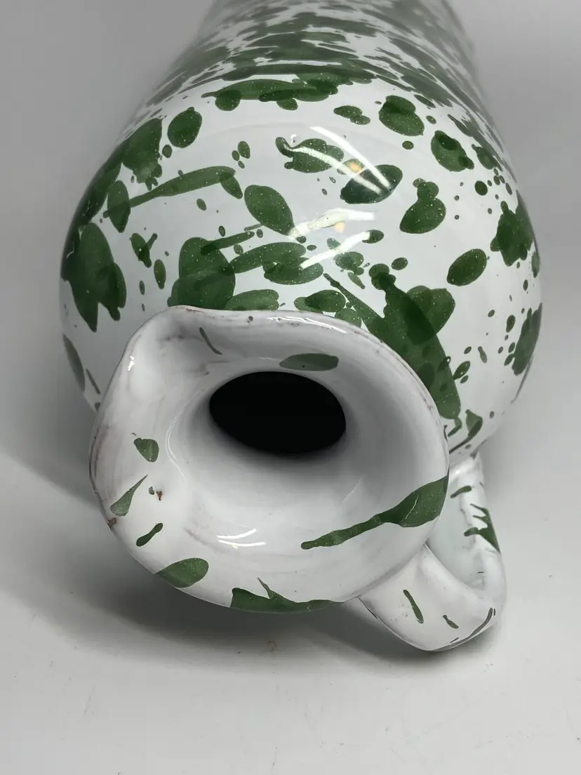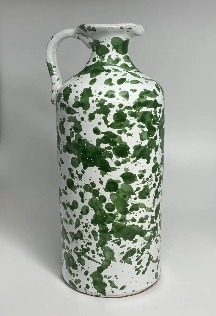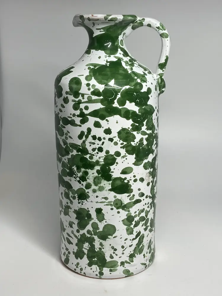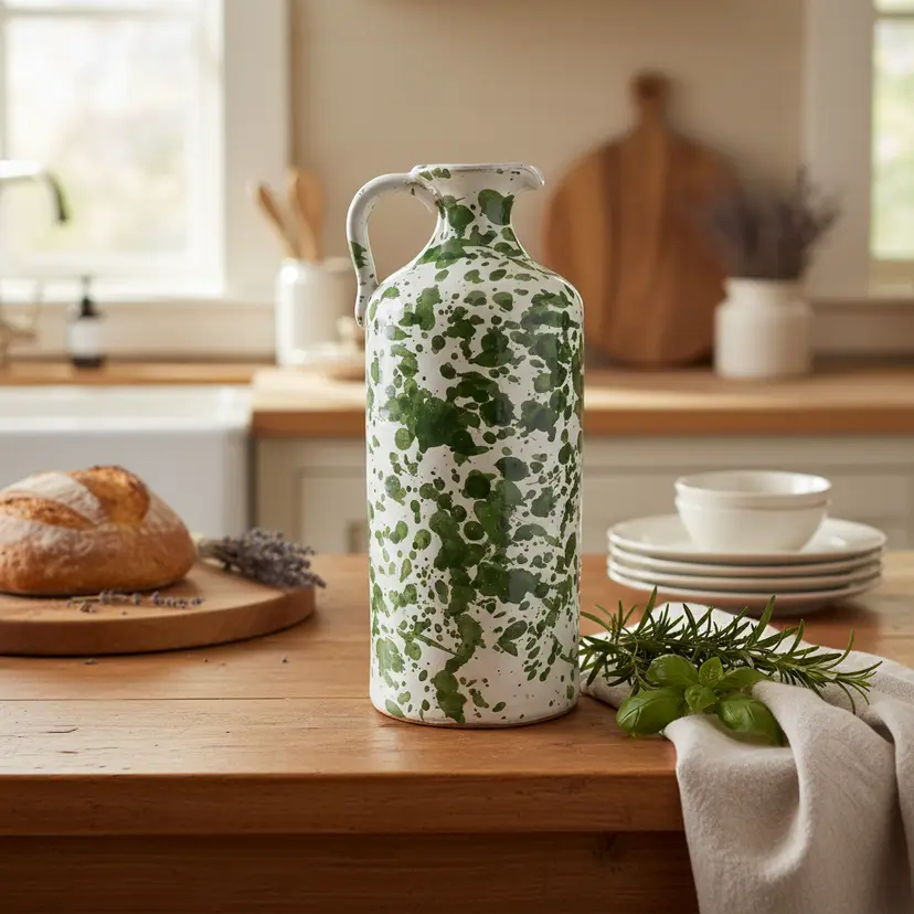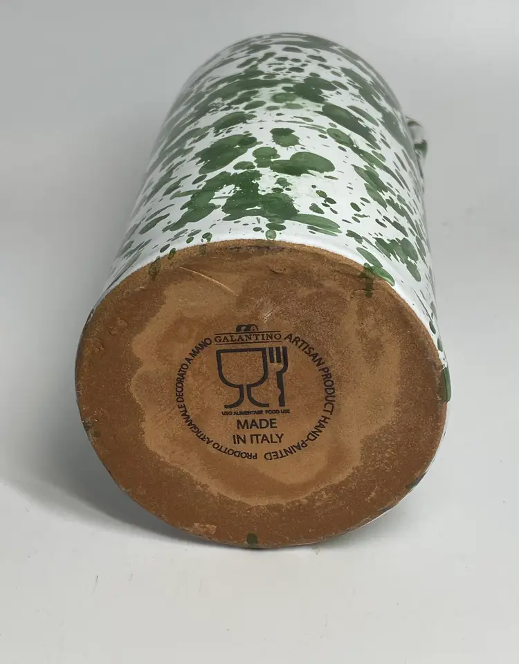 The Hand Painted Frantoio Galantino Ceramic Olive Oil Jug is a beautifully crafted decorative piece that is perfect for your kitchen or dining table. Made in the charming region of Puglia, Italy, this green and white ceramic jug features traditional designs and a height of 8 inches. The Frantoio Galantino brand ensures quality and authenticity, making this unique olive oil jug a stylish and functional addition to any home. Its hand-painted details add a touch of rustic elegance to your kitchen decor, making it both a practical and aesthetic choice for storing and dispensing your favorite oils or vinegars.