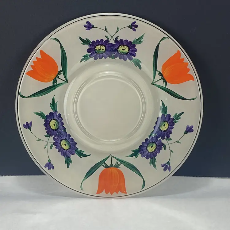 • Reverse painted (painted from the backside) • Hand-painted floral design with orange and purple flowers • Raised 3 1/2 inch center for you to add a bowl for dip • Versatile for serving or decorative purposes