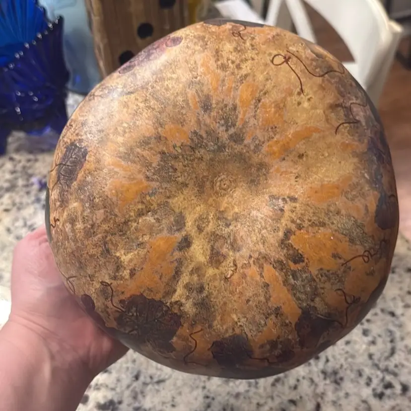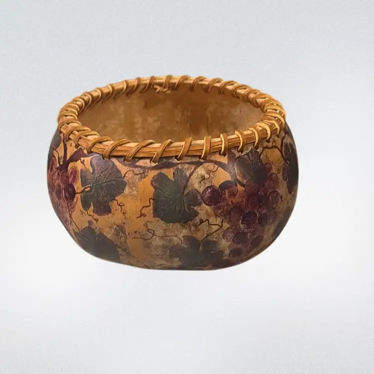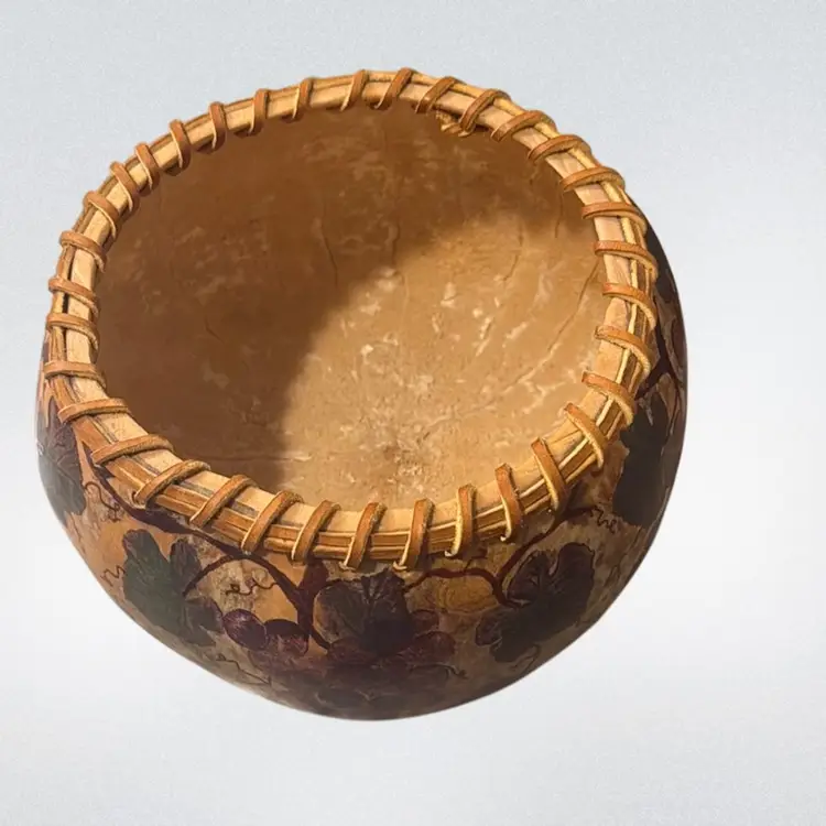Hand-Painted Gourd Bowl with Leather Ribbon Trim.