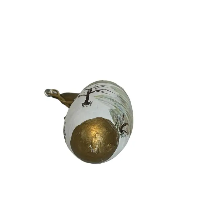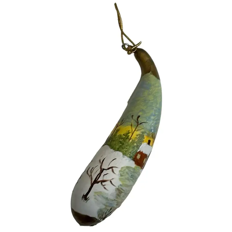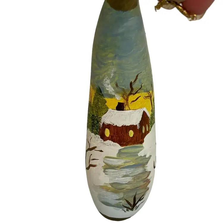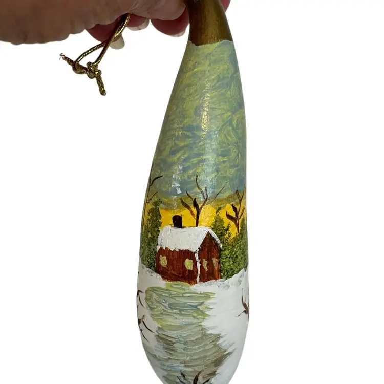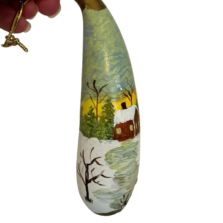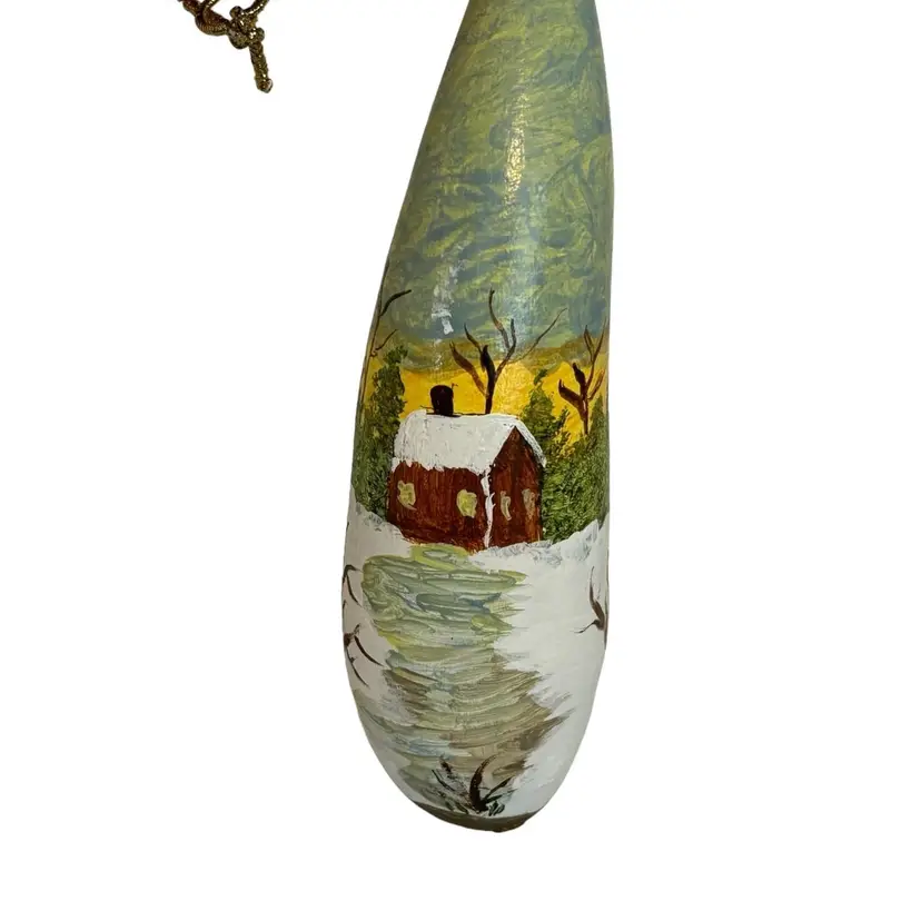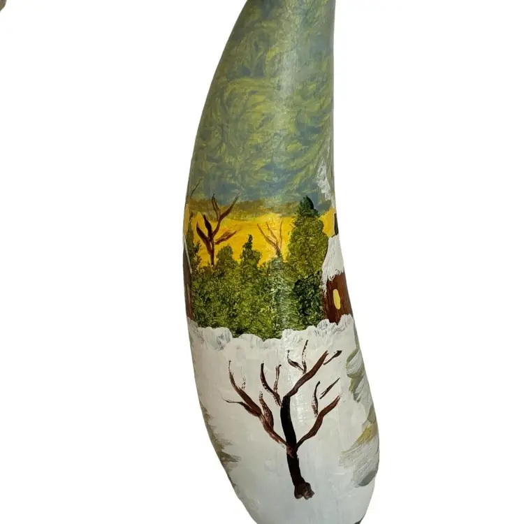 This beautiful gourd has a hand painted winter country scene on it with two houses. It measures approximately 1 1/2" L x 1 1/2" W x 6 1/4" H. It is in very nice condition with no chips or cracks. Please see photos and feel free to contact me with any questions. Thank you.